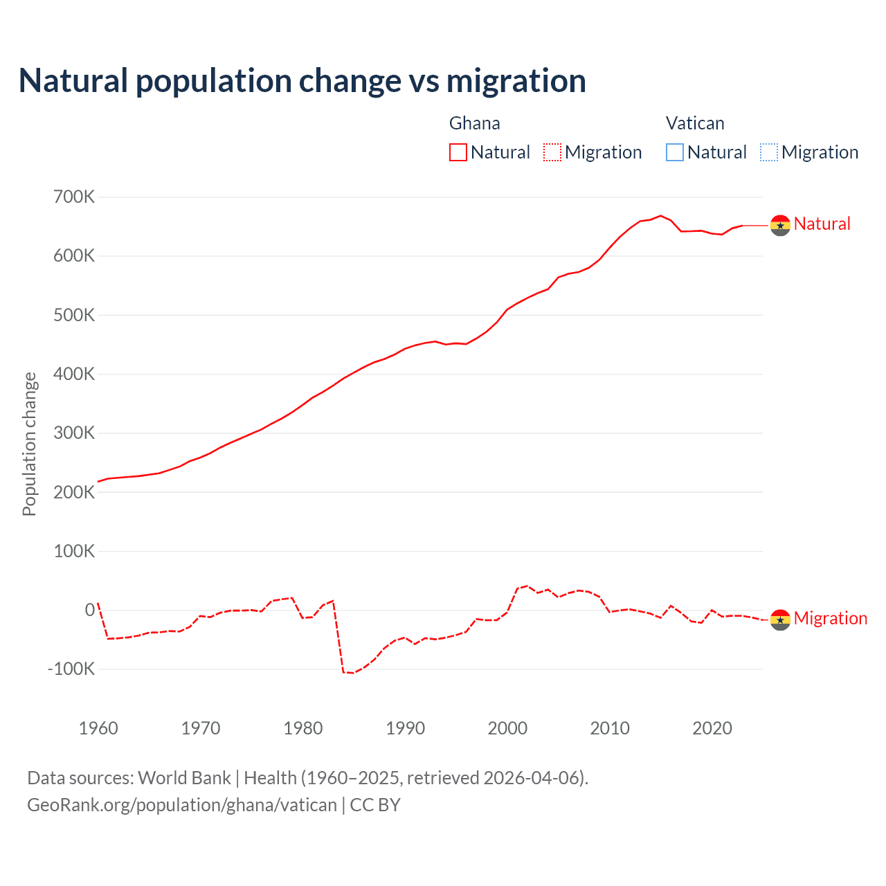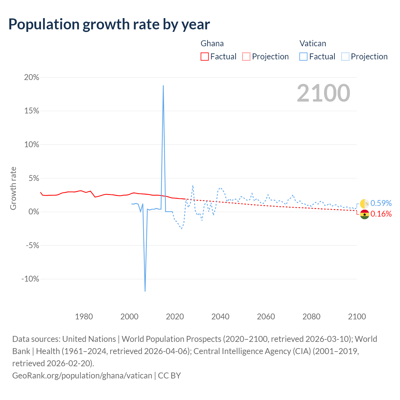 - For the last 10 years, Ghana has had an average growth rate of +2.1% per year vs +1.9% in the Vatican.