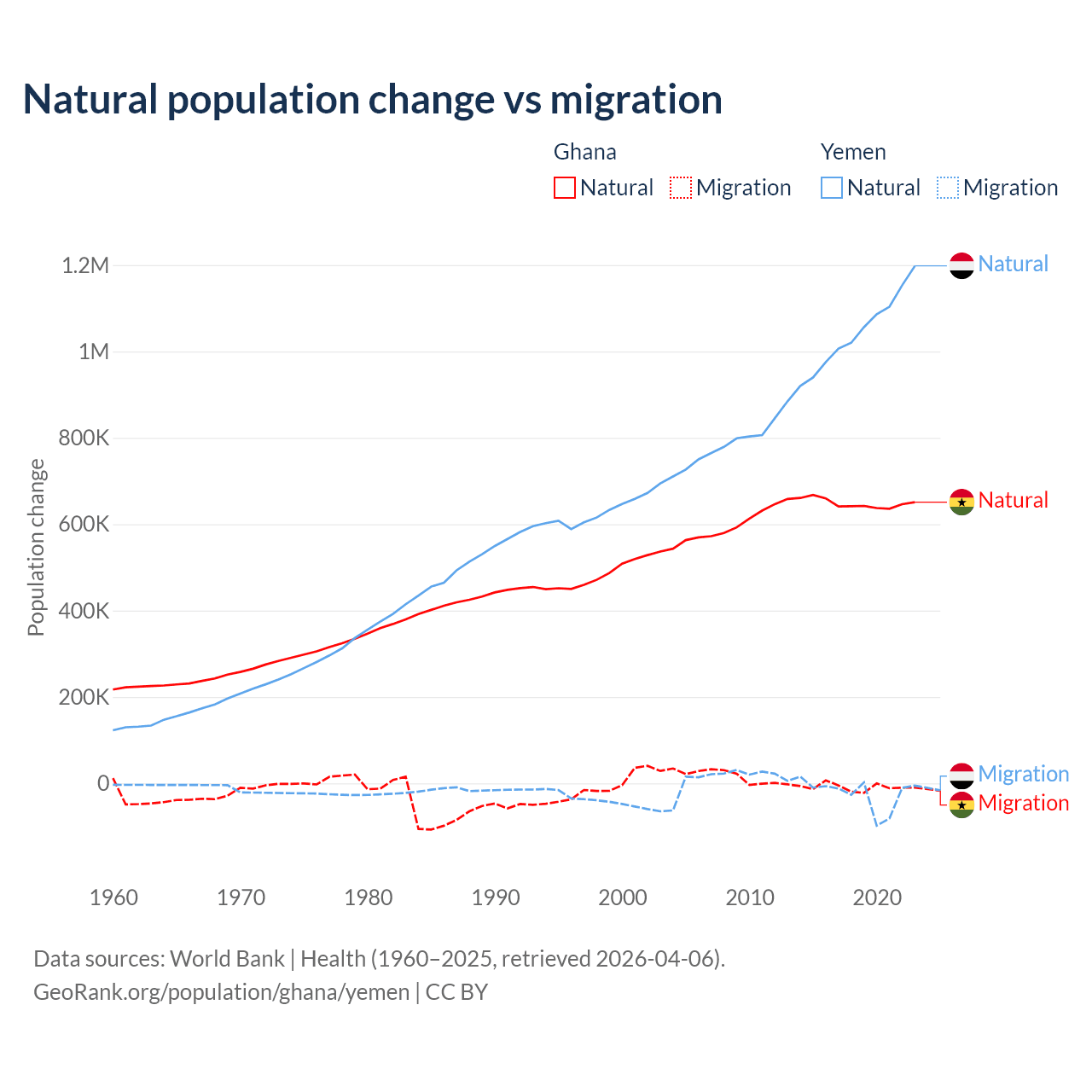 Over the last 10 years, 98.6% of the population change in Ghana is from natural causes (a gain of 6,484,449 people) and 1.37% is from migration (a loss of 90,310 people). In Yemen 97.8% is from natural causes (a gain of 10,460,813 people) and 2.17% is from migration (a loss of 231,814 people).