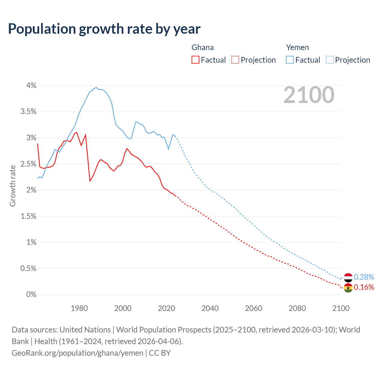 - For the last 10 years, Ghana has had an average growth rate of +2.1% per year vs +3% in Yemen.