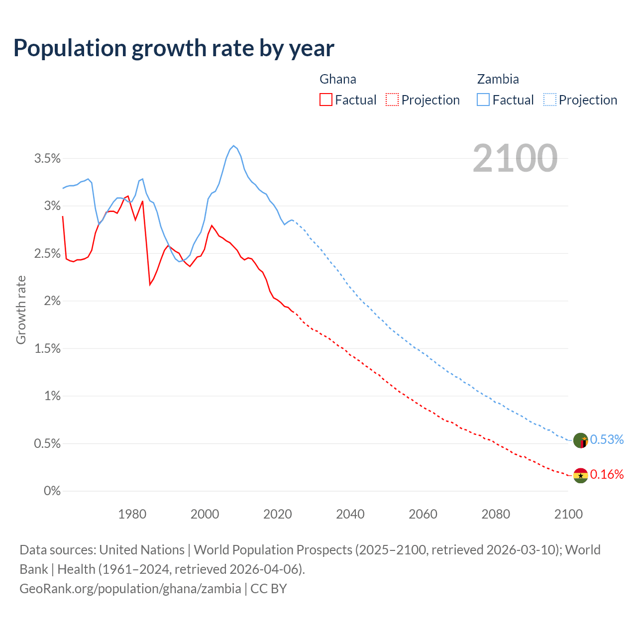 - For the last 10 years, Ghana has had an average growth rate of +2.1% per year vs +3% in Zambia.