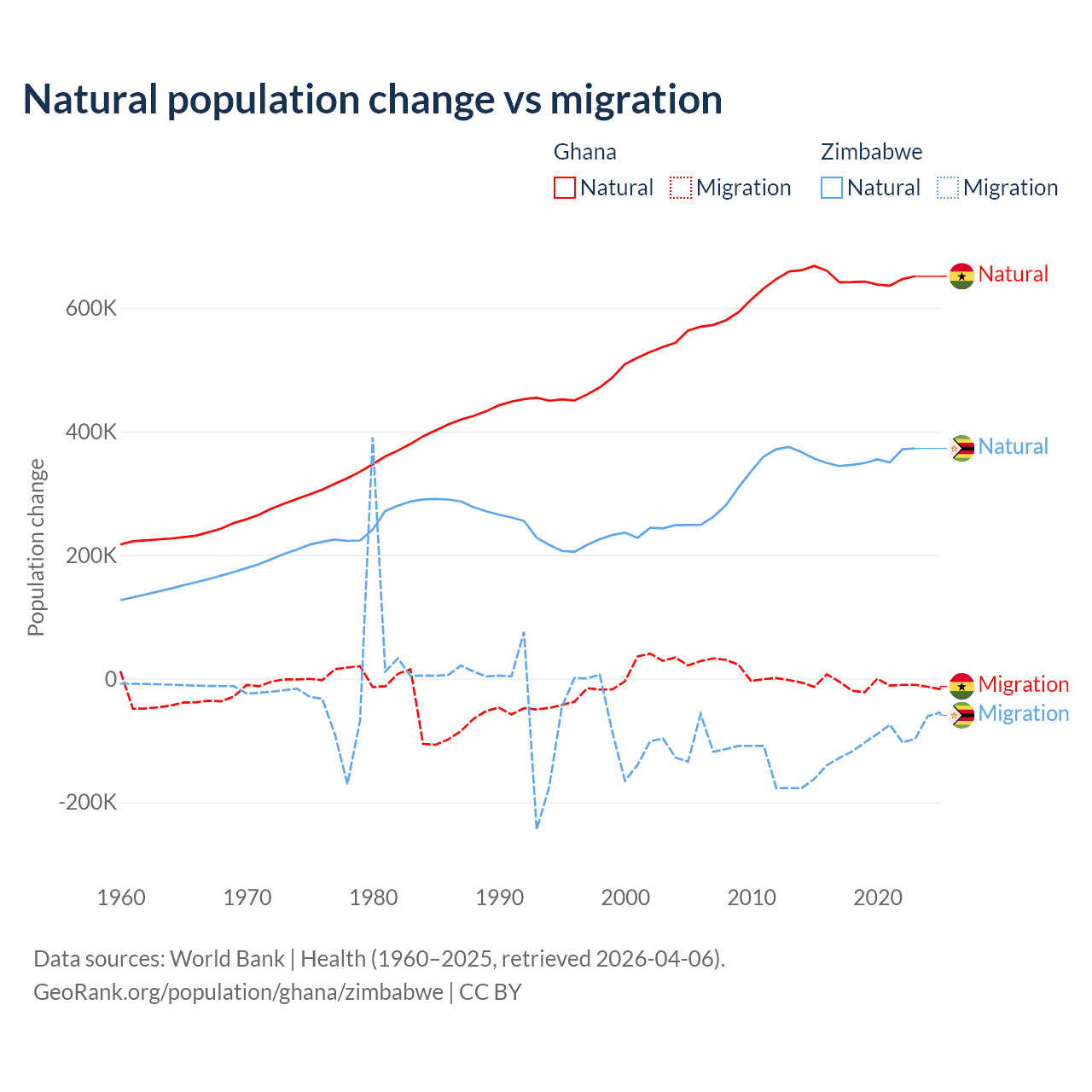 Over the last 10 years, 98.6% of the population change in Ghana is from natural causes (a gain of 6,484,449 people) and 1.37% is from migration (a loss of 90,310 people). In Zimbabwe 74.9% is from natural causes (a gain of 3,558,487 people) and 25.1% is from migration (a loss of 1,192,807 people).