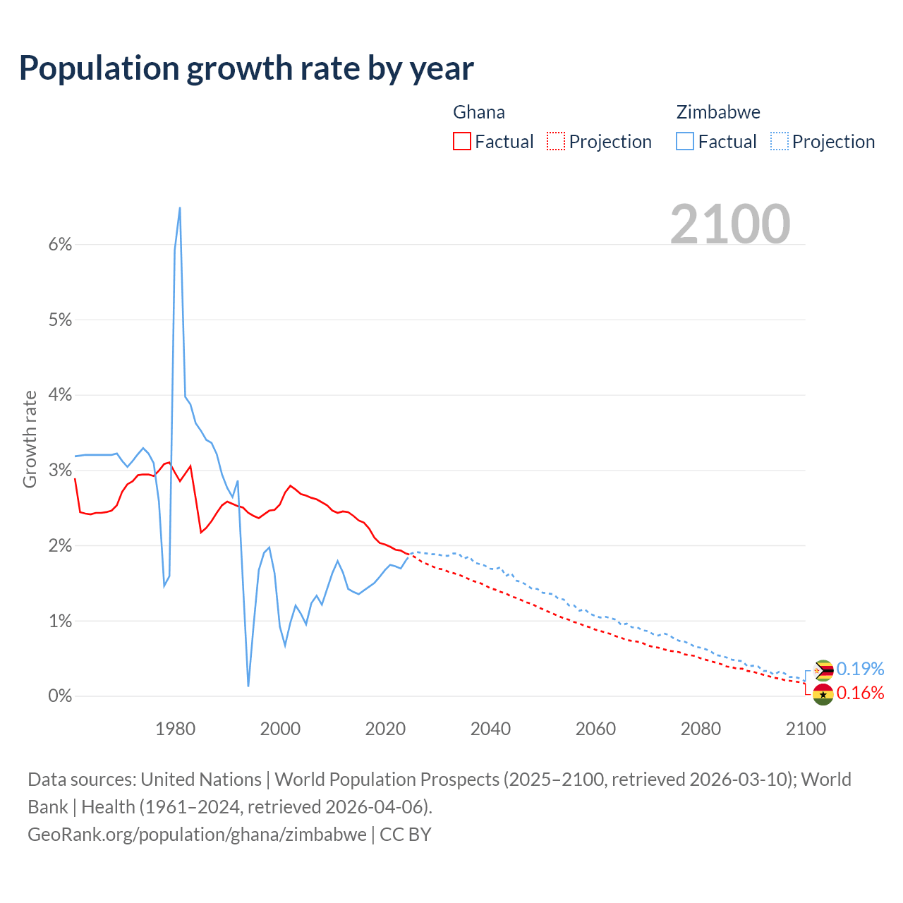 - For the last 10 years, Ghana has had an average growth rate of +2.1% per year vs +1.57% in Zimbabwe.