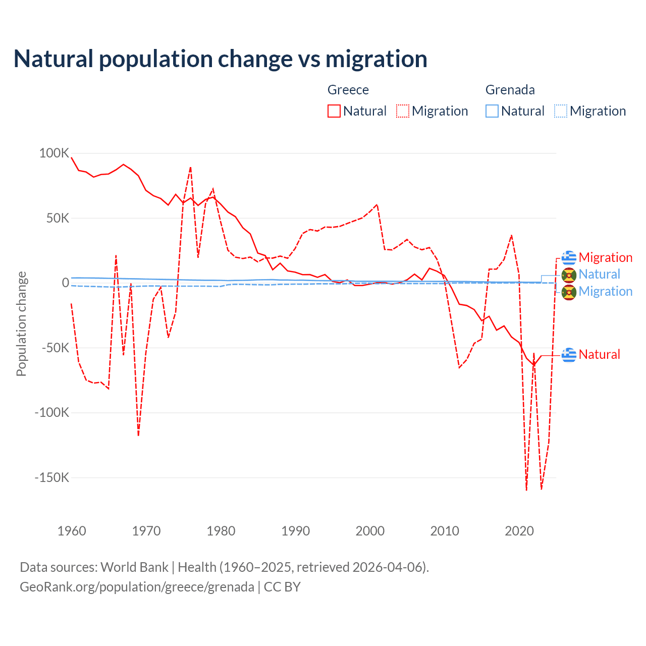 Over the last 10 years, 51.9% of the population change in Greece is from natural causes (a loss of 411,426 people) and 48.1% is from migration (a loss of 381,824 people). In Grenada 76% is from natural causes (a gain of 4,850 people) and 24% is from migration (a loss of 1,535 people).