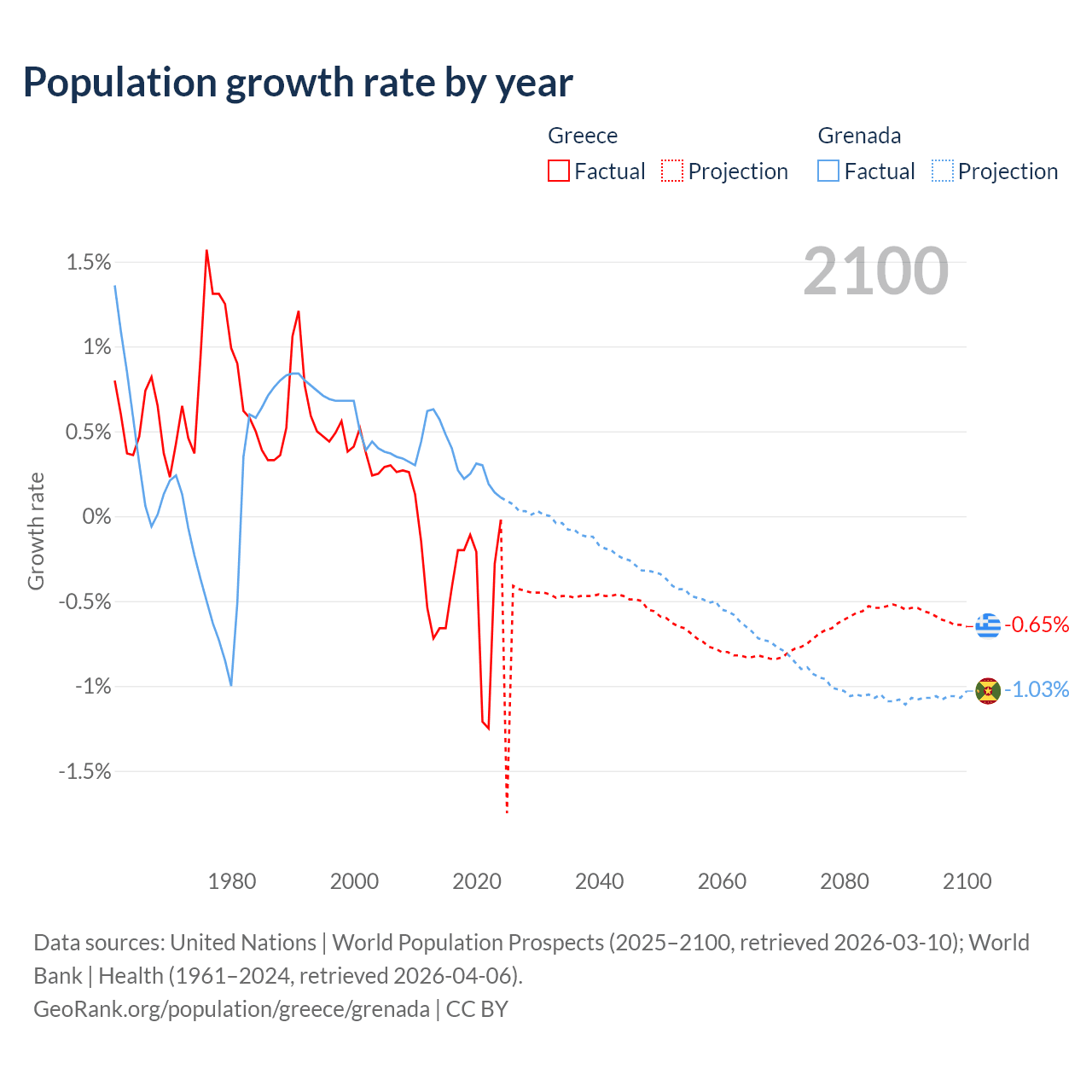 - For the last 10 years, Greece has had an average growth rate of -0.47% per year vs +0.29% in Grenada.