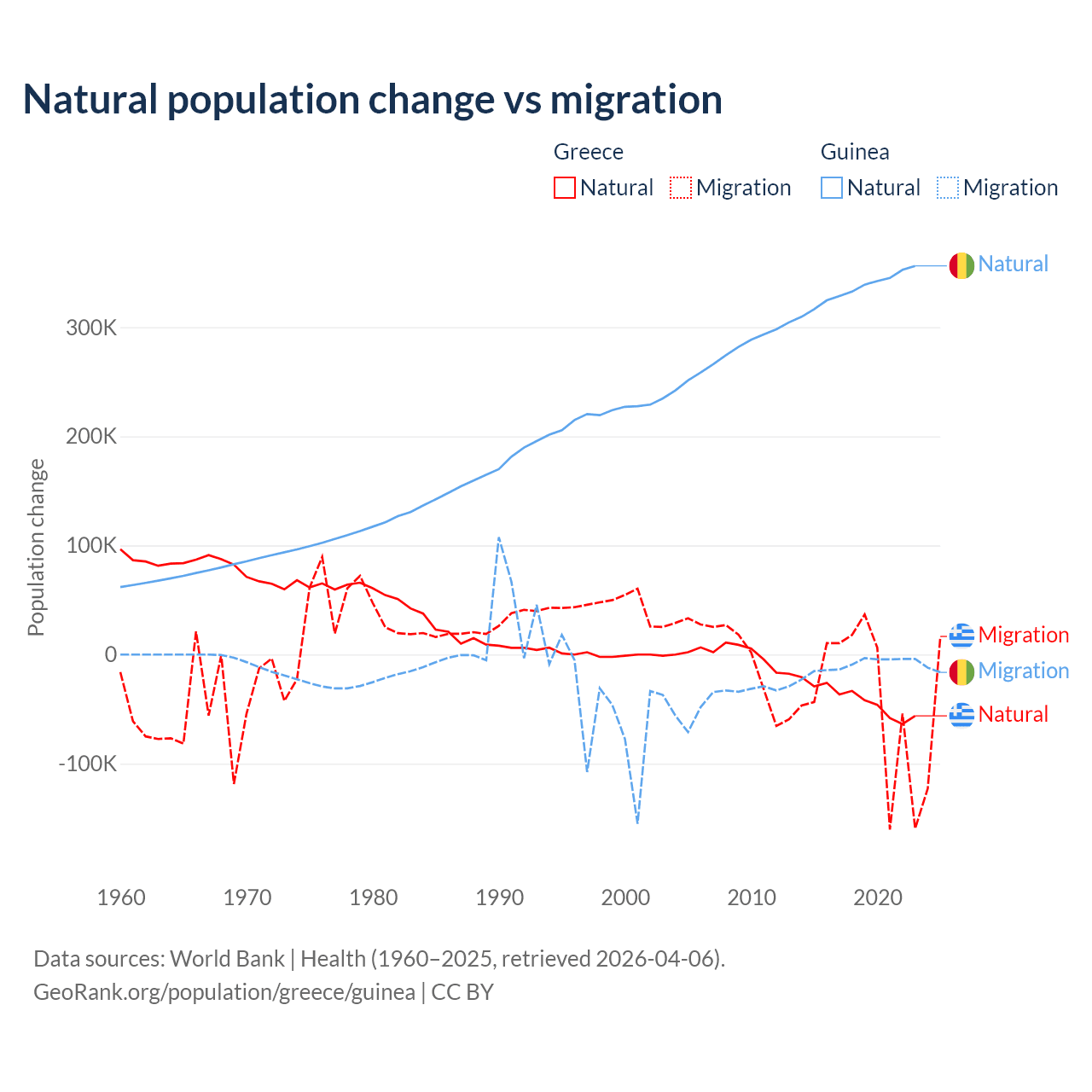 Over the last 10 years, 51.9% of the population change in Greece is from natural causes (a loss of 411,426 people) and 48.1% is from migration (a loss of 381,824 people). In Guinea 97.2% is from natural causes (a gain of 3,346,936 people) and 2.76% is from migration (a loss of 94,924 people).