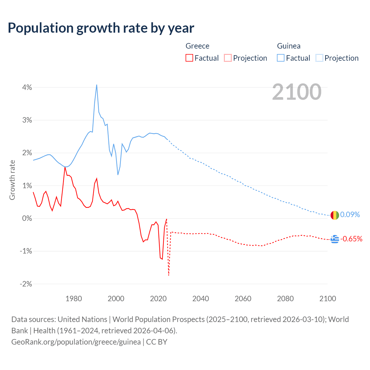 - For the last 10 years, Greece has had an average growth rate of -0.47% per year vs +2.54% in Guinea.