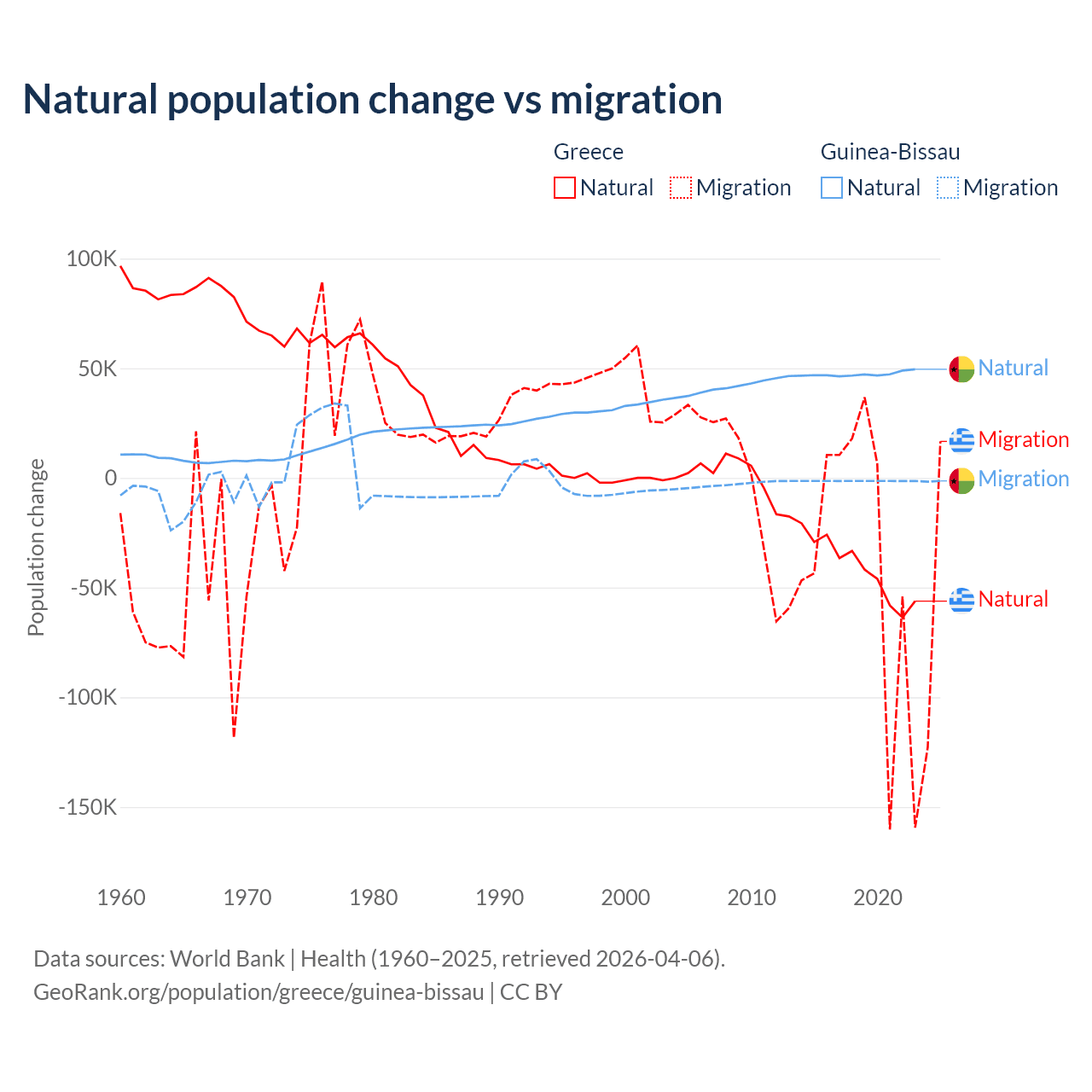 Over the last 10 years, 51.9% of the population change in Greece is from natural causes (a loss of 411,426 people) and 48.1% is from migration (a loss of 381,824 people). In Guinea-Bissau 97.1% is from natural causes (a gain of 472,826 people) and 2.87% is from migration (a loss of 13,956 people).