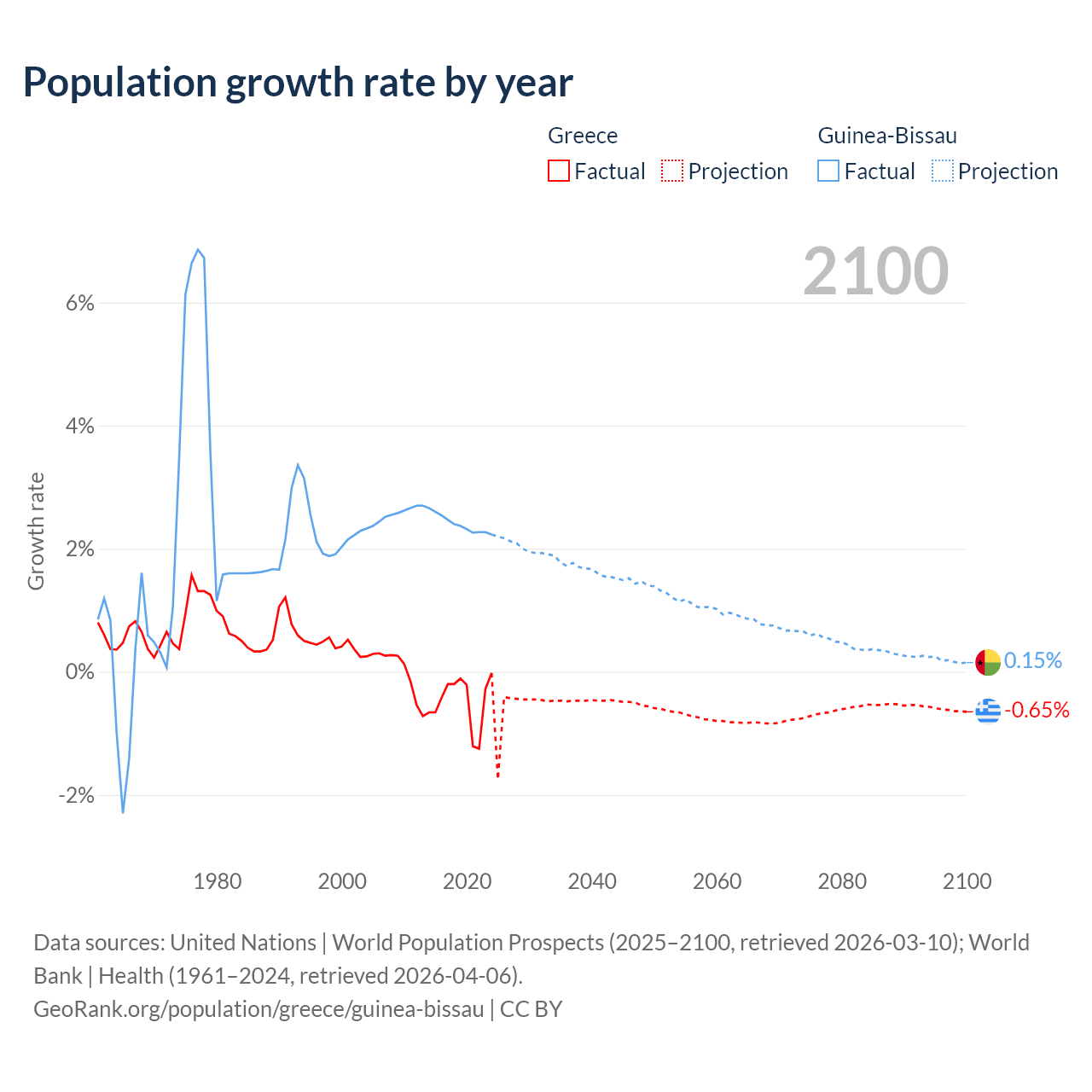 - For the last 10 years, Greece has had an average growth rate of -0.47% per year vs +2.4% in Guinea-Bissau.