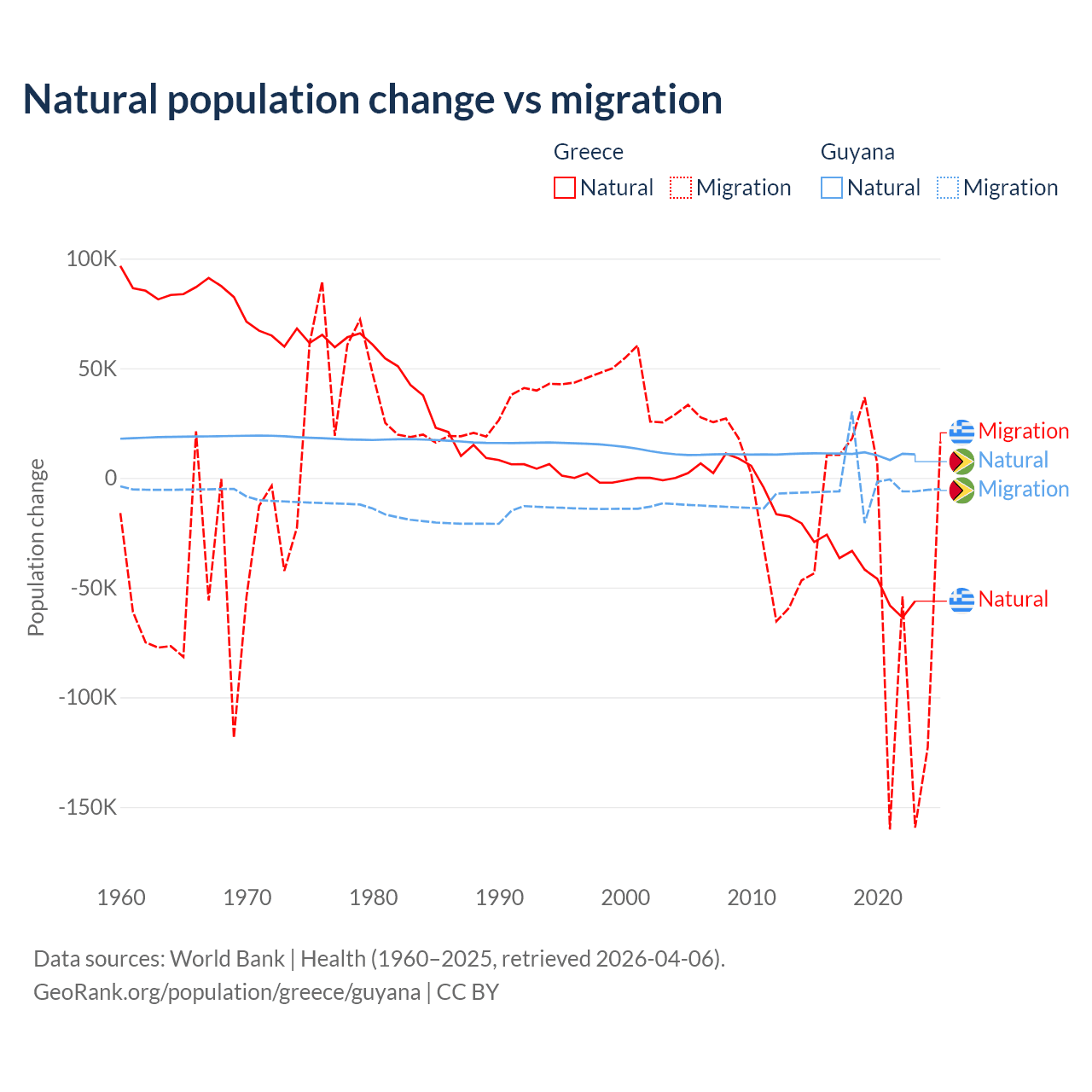 Over the last 10 years, 51.9% of the population change in Greece is from natural causes (a loss of 411,426 people) and 48.1% is from migration (a loss of 381,824 people). In Guyana 77.7% is from natural causes (a gain of 107,419 people) and 22.3% is from migration (a loss of 30,797 people).