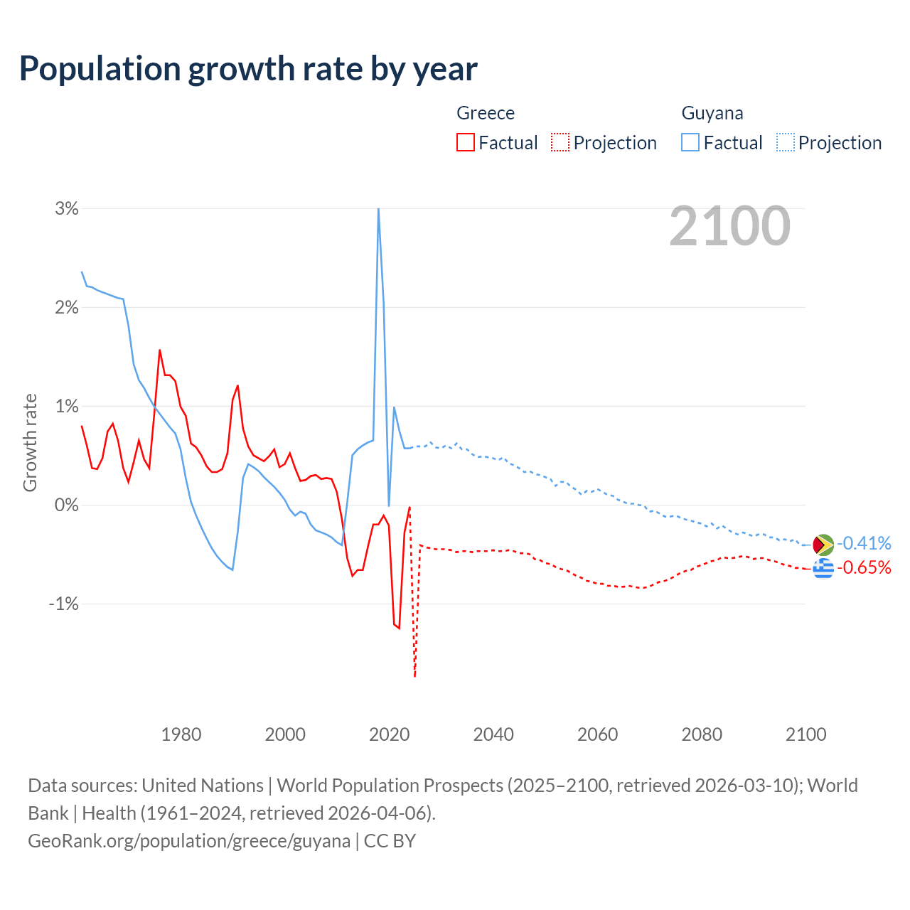 - For the last 10 years, Greece has had an average growth rate of -0.47% per year vs +0.94% in Guyana.