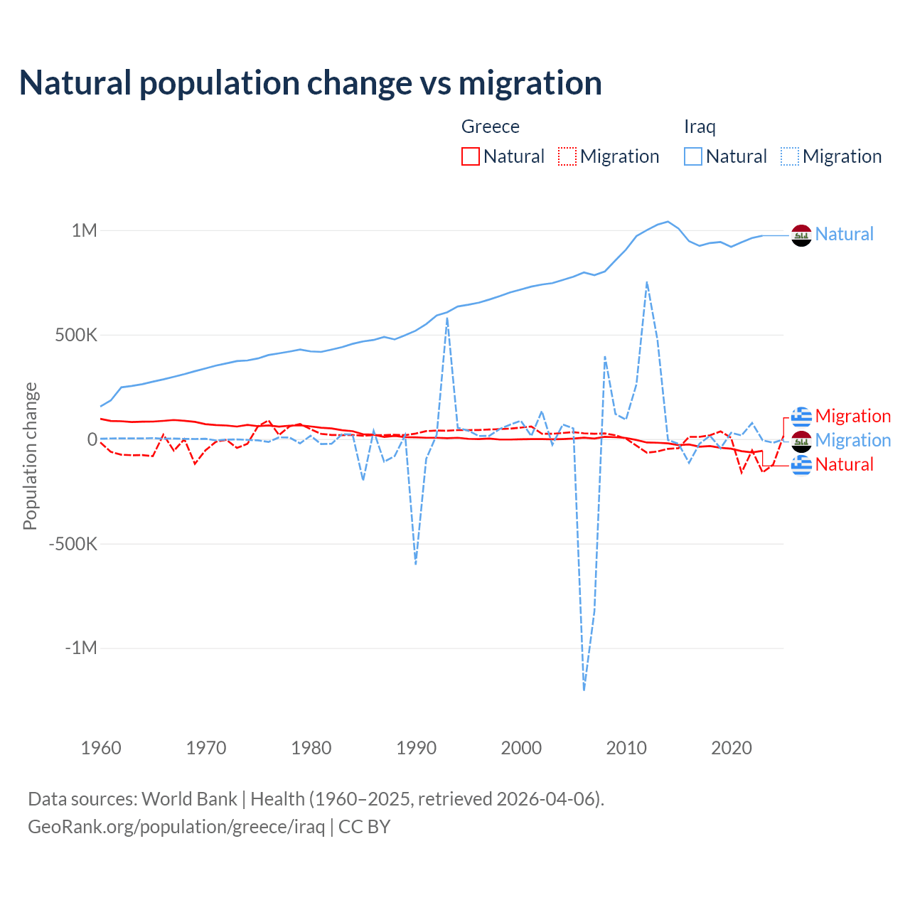Over the last 10 years, 51.9% of the population change in Greece is from natural causes (a loss of 411,426 people) and 48.1% is from migration (a loss of 381,824 people). In Iraq 99.2% is from natural causes (a gain of 9,598,842 people) and 0.76% is from migration (a loss of 73,050 people).