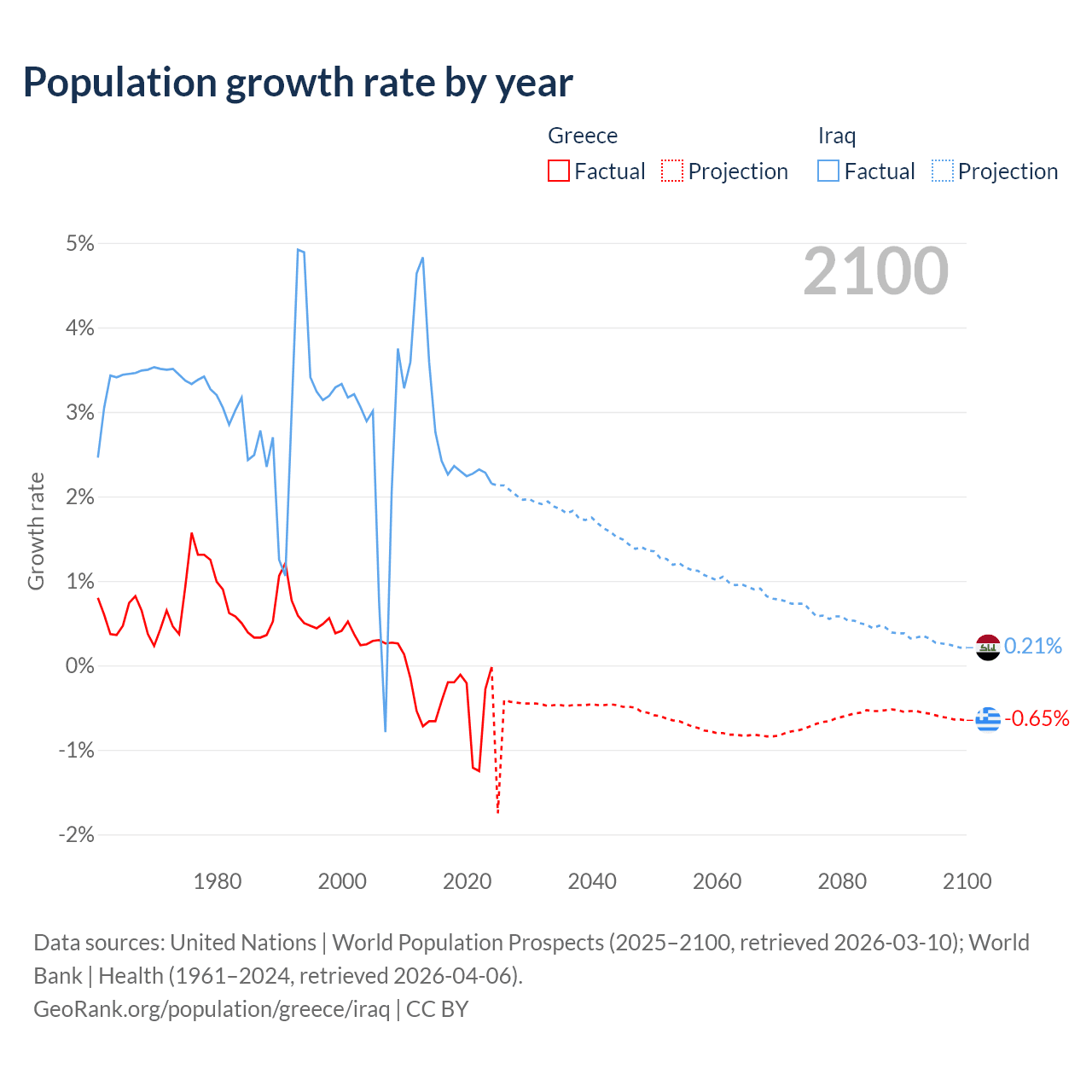 - For the last 10 years, Greece has had an average growth rate of -0.47% per year vs +2.45% in Iraq.