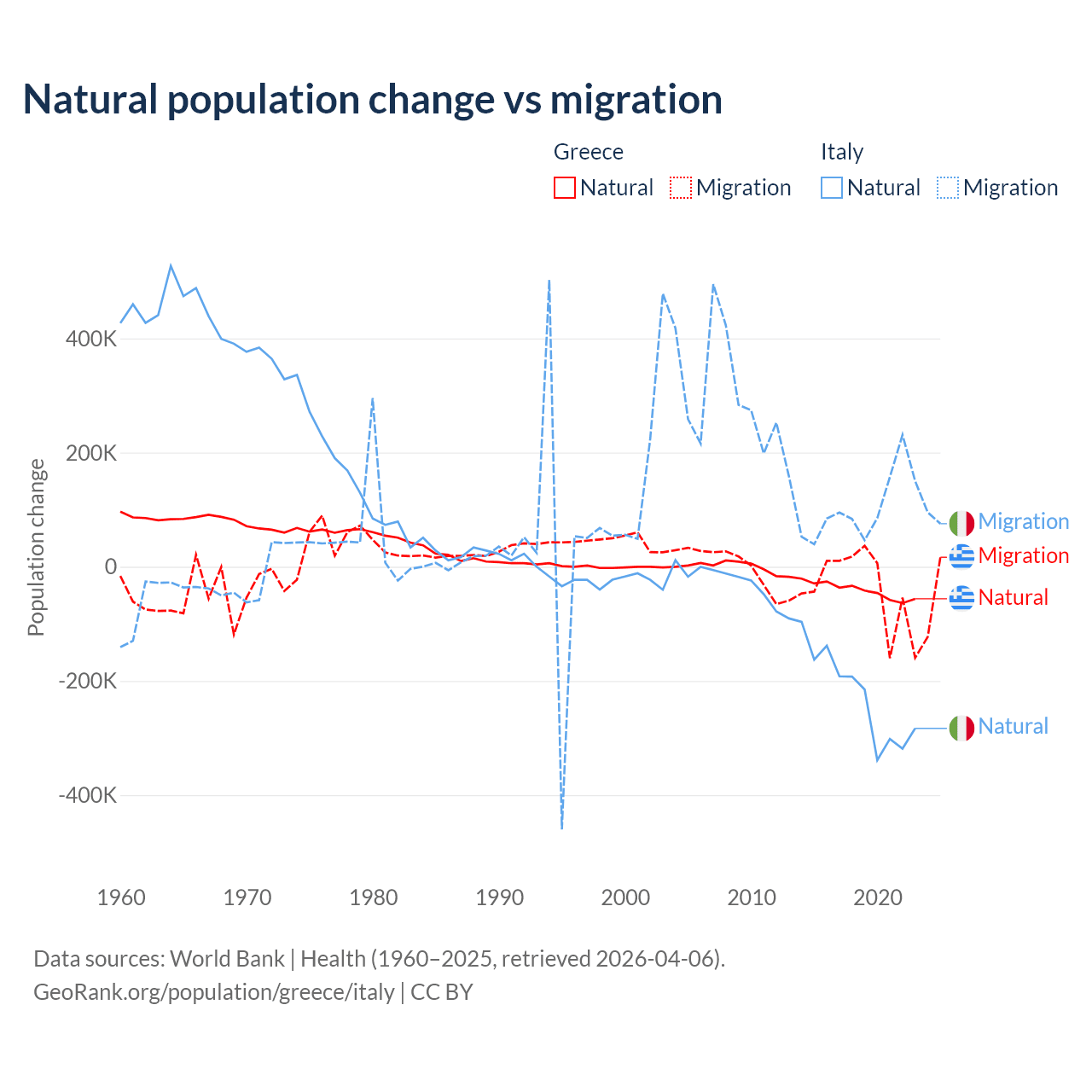 Over the last 10 years, 51.9% of the population change in Greece is from natural causes (a loss of 411,426 people) and 48.1% is from migration (a loss of 381,824 people). In Italy 68.6% is from natural causes (a loss of 2,239,084 people) and 31.4% is from migration (a gain of 1,026,128 people).