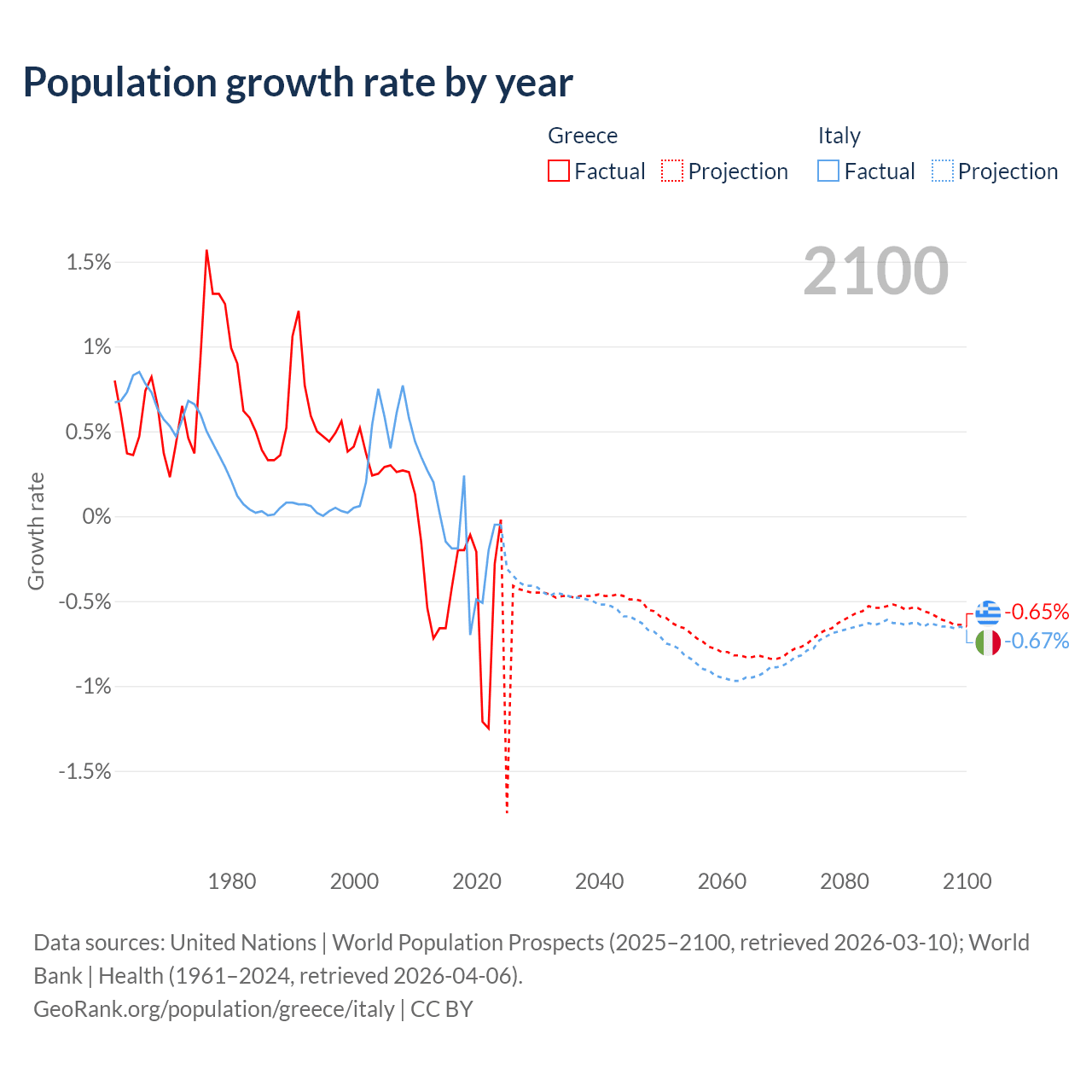 Data sources: World Bank | Health (1960–2024, retrieved 2026-04-06); United Nations | World Population Prospects (1960–2026, retrieved 2026-03-10); U.S. Census Bureau (1960–2025, retrieved 2026-02-08); Central Intelligence Agency (CIA) (2000–2019, retrieved 2026-02-20).