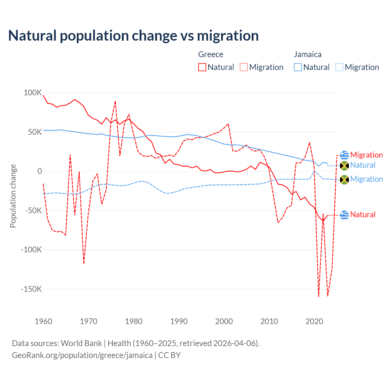 Over the last 10 years, 51.9% of the population change in Greece is from natural causes (a loss of 411,426 people) and 48.1% is from migration (a loss of 381,824 people). In Jamaica 61.3% is from natural causes (a gain of 137,465 people) and 38.7% is from migration (a loss of 86,681 people).