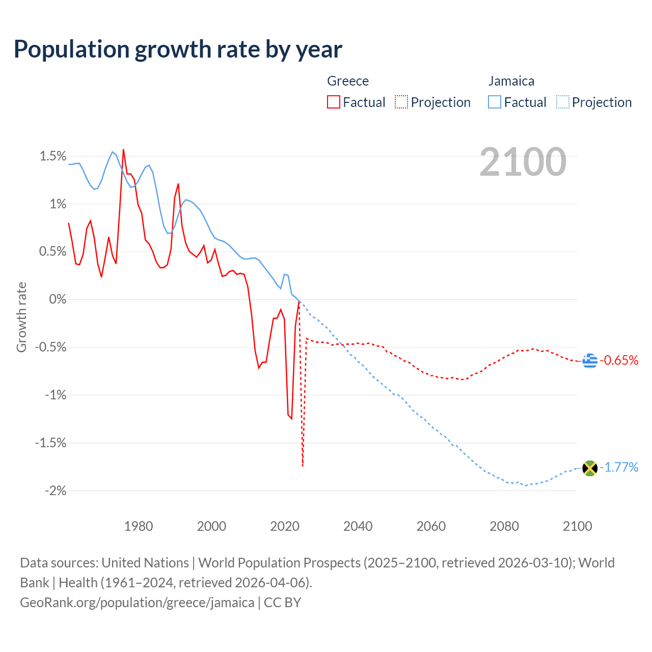 - For the last 10 years, Greece has had an average growth rate of -0.47% per year vs +0.18% in Jamaica.