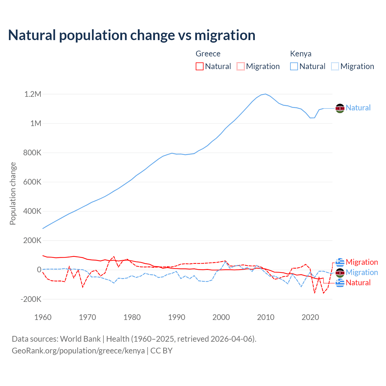 Over the last 10 years, 51.9% of the population change in Greece is from natural causes (a loss of 411,426 people) and 48.1% is from migration (a loss of 381,824 people). In Kenya 95.3% is from natural causes (a gain of 10,892,362 people) and 4.67% is from migration (a loss of 533,876 people).