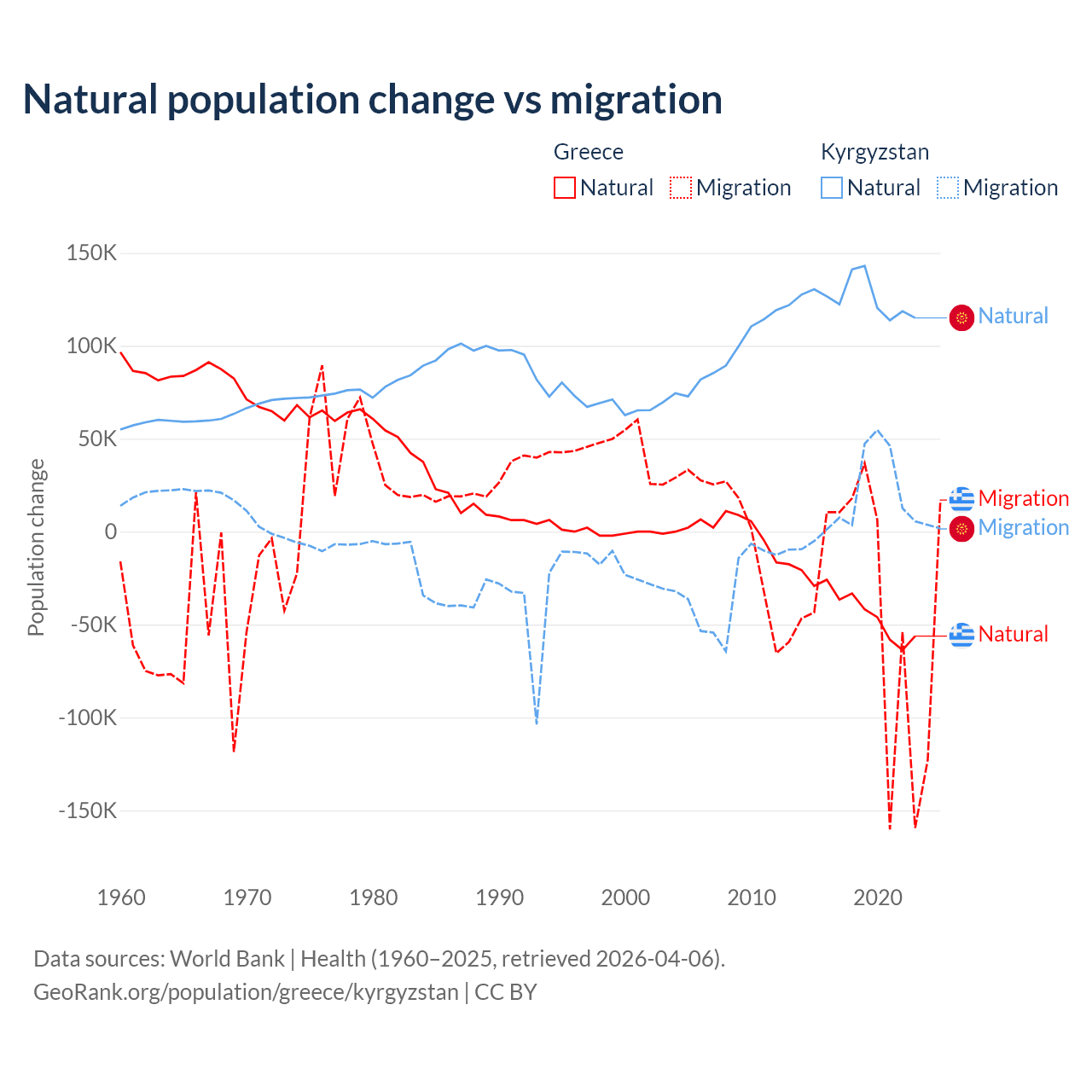 Over the last 10 years, 51.9% of the population change in Greece is from natural causes (a loss of 411,426 people) and 48.1% is from migration (a loss of 381,824 people). In Kyrgyzstan 88.5% is from natural causes (a gain of 1,258,837 people) and 11.5% is from migration (a gain of 164,132 people).