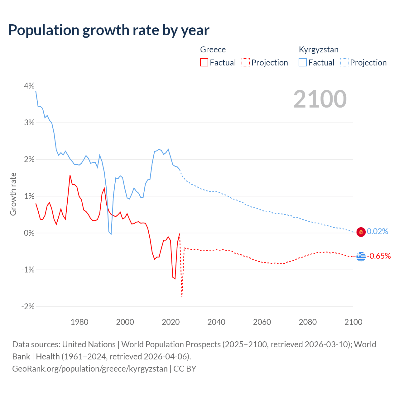 Data sources: World Bank | Health (1960–2024, retrieved 2026-04-06); United Nations | World Population Prospects (1960–2026, retrieved 2026-03-10); U.S. Census Bureau (1960–2025, retrieved 2026-02-08); Central Intelligence Agency (CIA) (2000–2019, retrieved 2026-02-20).