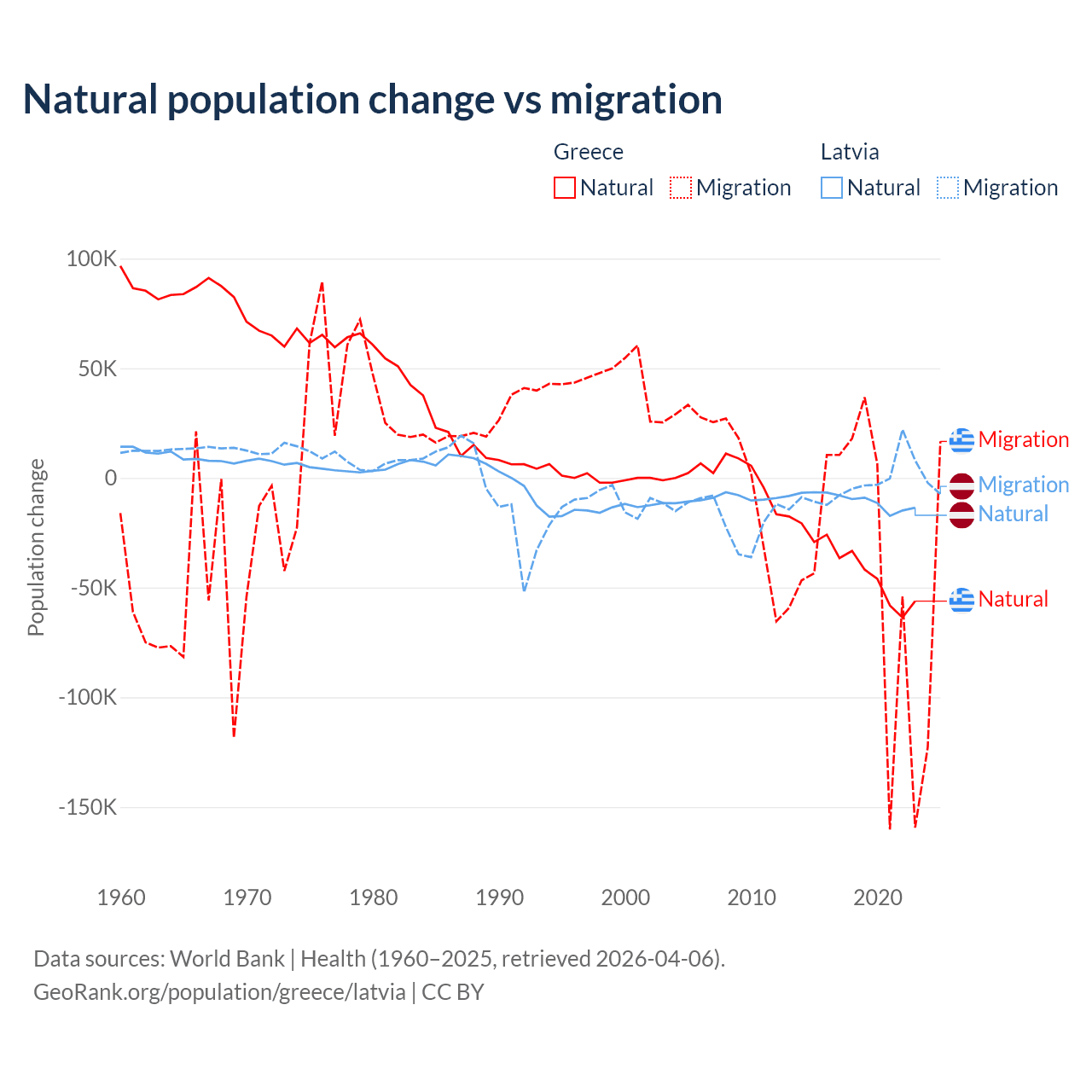Over the last 10 years, 51.9% of the population change in Greece is from natural causes (a loss of 411,426 people) and 48.1% is from migration (a loss of 381,824 people). In Latvia 82.7% is from natural causes (a loss of 103,711 people) and 17.3% is from migration (a loss of 21,641 people).