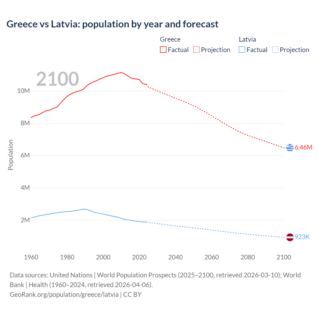 Greece vs Latvia: population by year and forecast