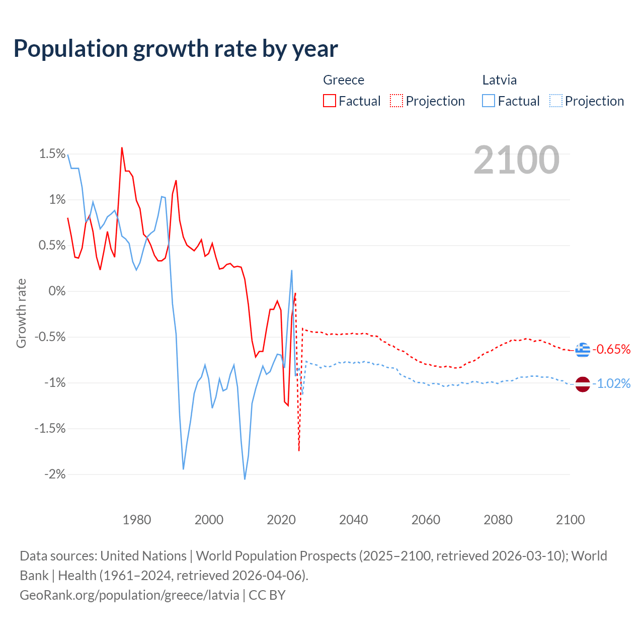 - For the last 10 years, Greece has had an average growth rate of -0.47% per year vs -0.68% in Latvia.
