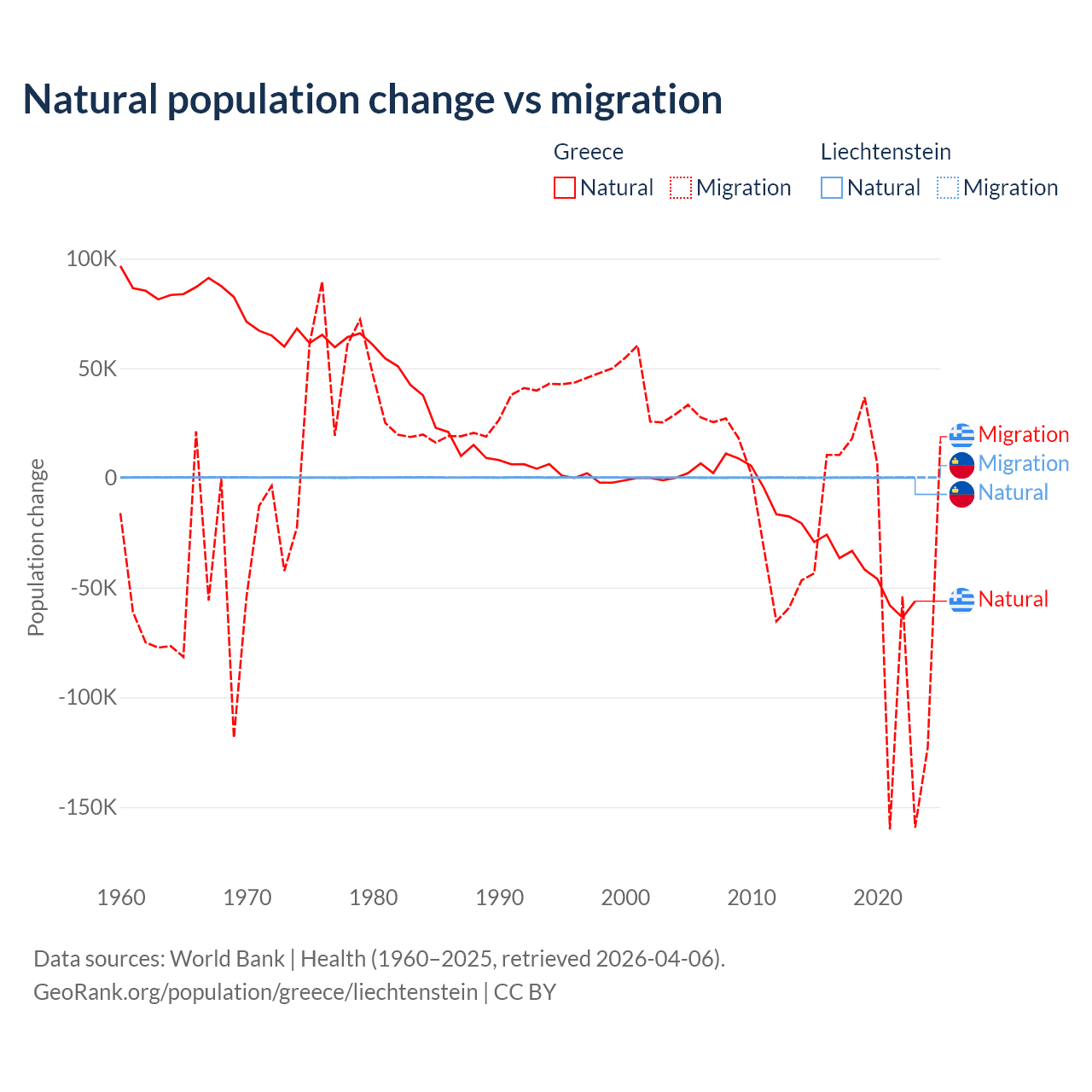 Over the last 10 years, 51.9% of the population change in Greece is from natural causes (a loss of 411,426 people) and 48.1% is from migration (a loss of 381,824 people). In Liechtenstein 32.4% is from natural causes (a gain of 883 people) and 67.6% is from migration (a gain of 1,843 people).