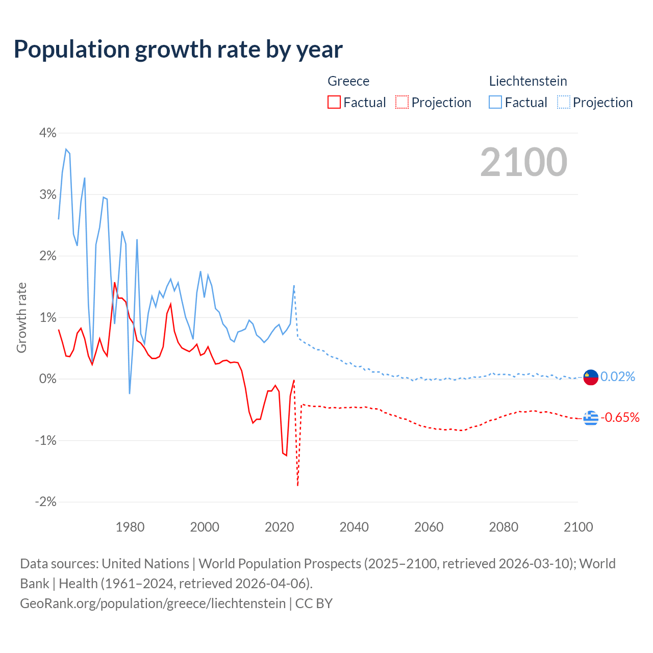 - For the last 10 years, Greece has had an average growth rate of -0.47% per year vs +0.82% in Liechtenstein.