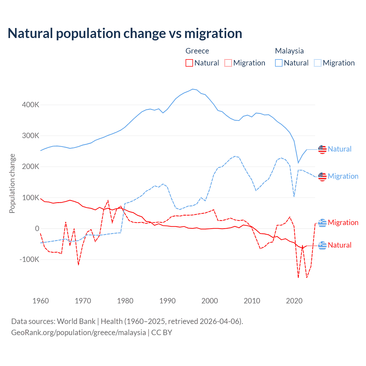 Over the last 10 years, 51.9% of the population change in Greece is from natural causes (a loss of 411,426 people) and 48.1% is from migration (a loss of 381,824 people). In Malaysia 61.7% is from natural causes (a gain of 3,029,648 people) and 38.3% is from migration (a gain of 1,882,159 people).
