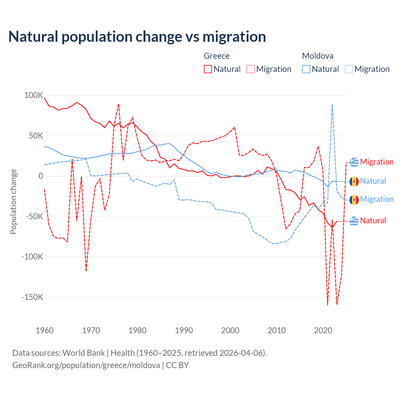 Over the last 10 years, 51.9% of the population change in Greece is from natural causes (a loss of 411,426 people) and 48.1% is from migration (a loss of 381,824 people). In Moldova 6.04% is from natural causes (a loss of 19,001 people) and 94% is from migration (a loss of 295,631 people).