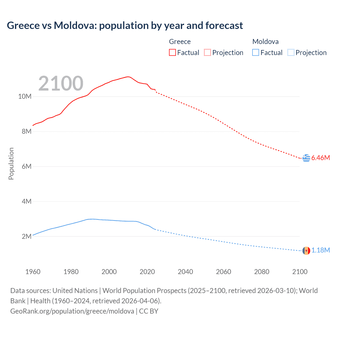 The latest officially reported population of Greece was 10,405,134 in 2024 vs 2,402,306 people in Moldova in 2024. In 2026, based on the adjusted UN estimation, the current Greece's population is 10,181,414 people compared to 2,341,166 in Moldova.
