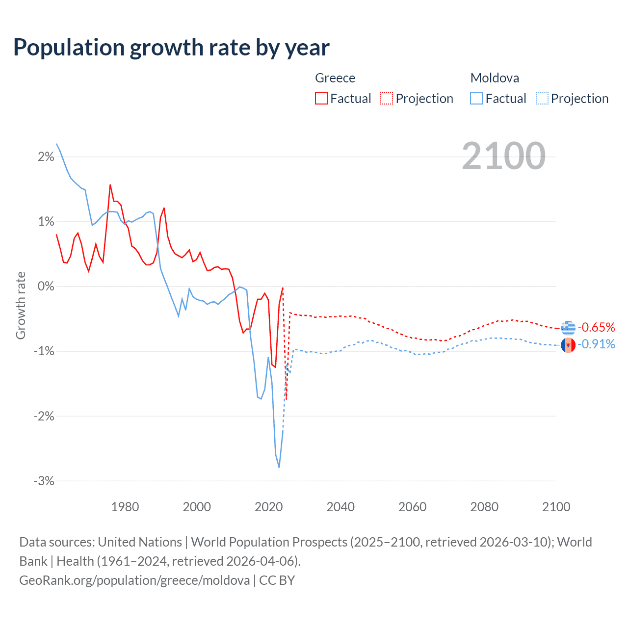 - For the last 10 years, Greece has had an average growth rate of -0.47% per year vs -1.57% in Moldova.