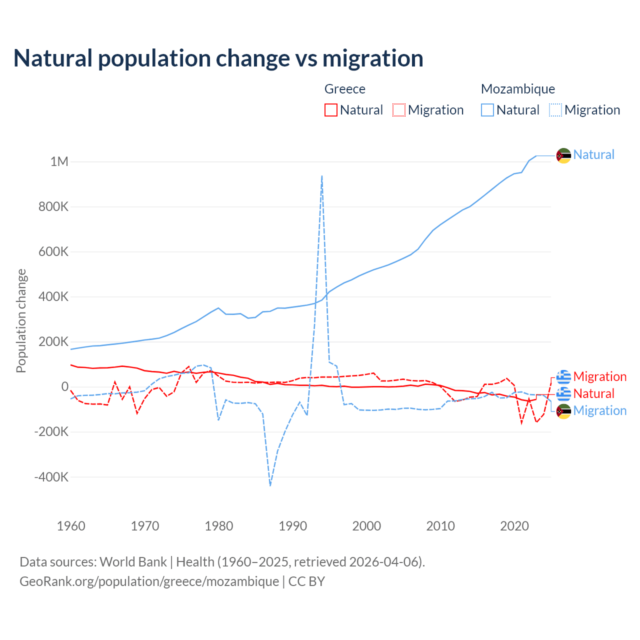 Over the last 10 years, 51.9% of the population change in Greece is from natural causes (a loss of 411,426 people) and 48.1% is from migration (a loss of 381,824 people). In Mozambique 95.9% is from natural causes (a gain of 9,108,203 people) and 4.15% is from migration (a loss of 393,923 people).
