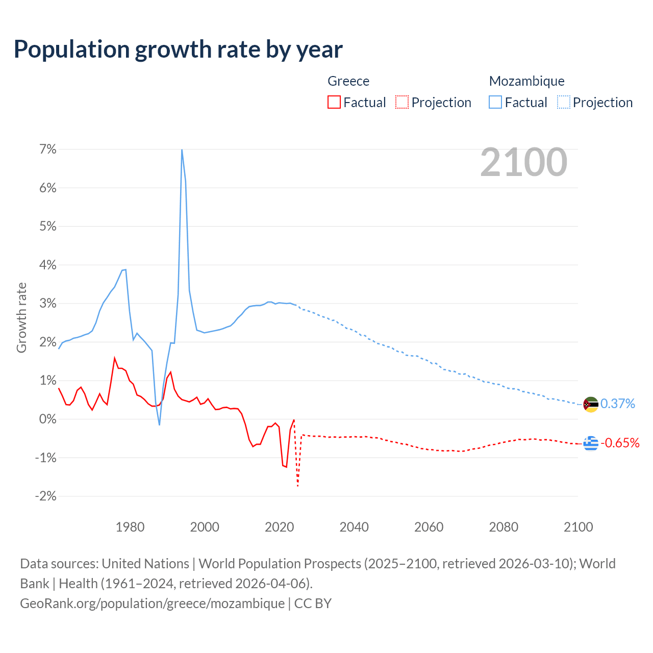 - For the last 10 years, Greece has had an average growth rate of -0.47% per year vs +2.99% in Mozambique.