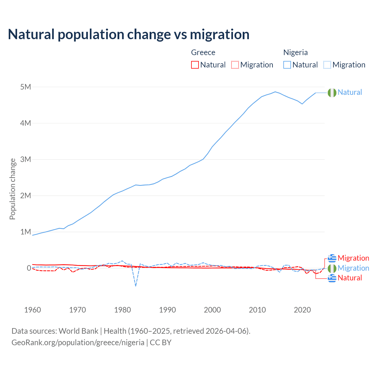 Over the last 10 years, 51.9% of the population change in Greece is from natural causes (a loss of 411,426 people) and 48.1% is from migration (a loss of 381,824 people). In Nigeria 99.2% is from natural causes (a gain of 47,163,517 people) and 0.77% is from migration (a loss of 368,103 people).