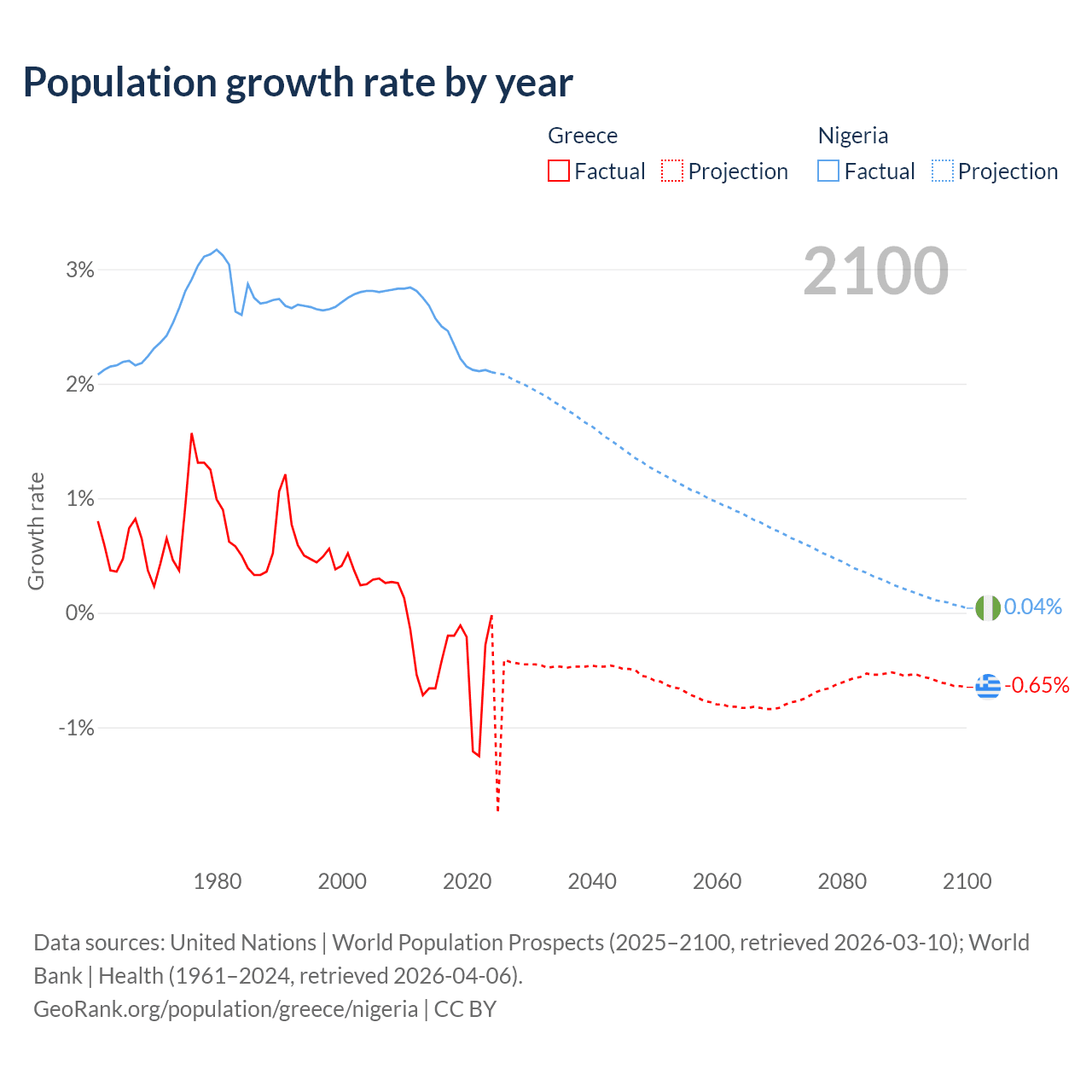 - For the last 10 years, Greece has had an average growth rate of -0.47% per year vs +2.31% in Nigeria.