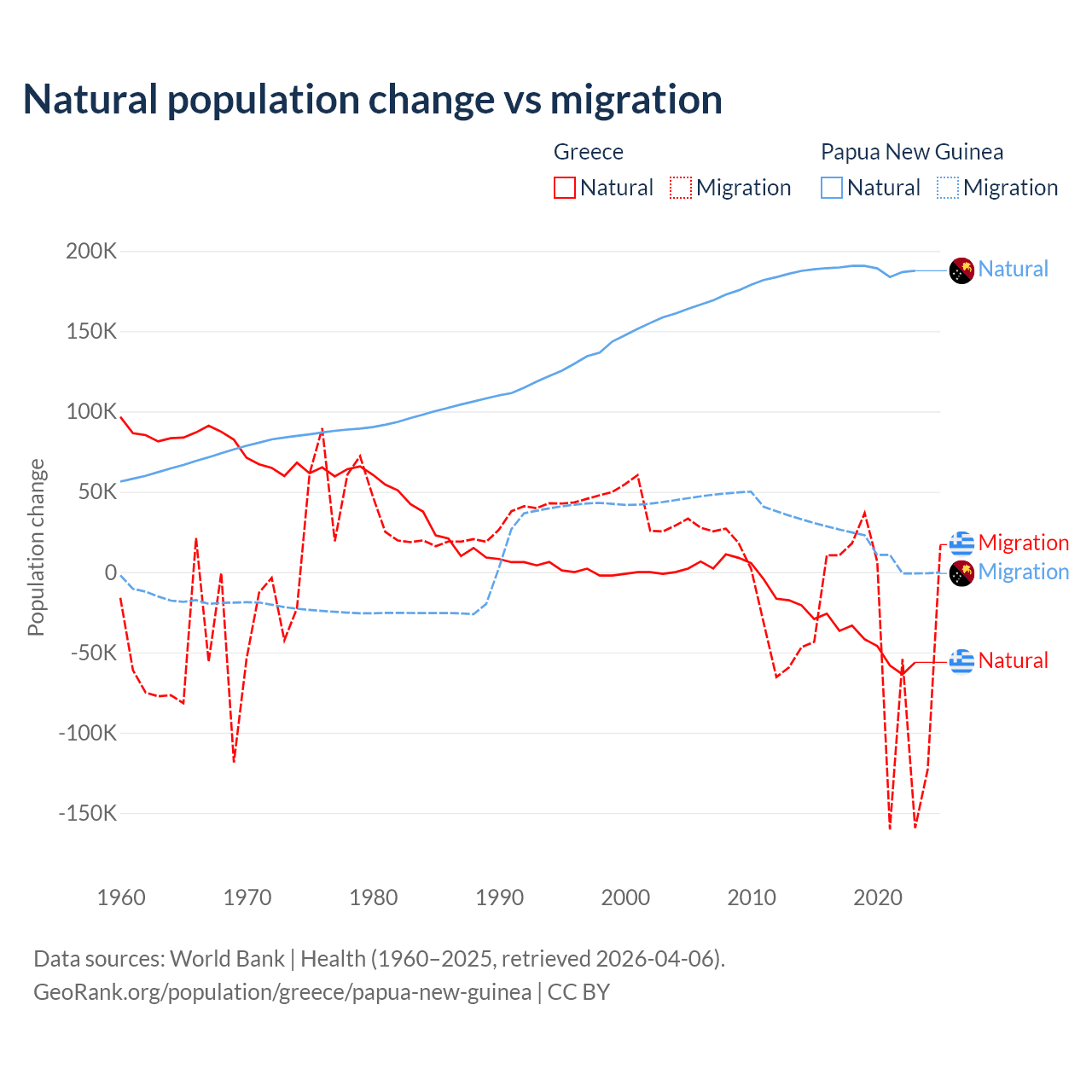 Over the last 10 years, 51.9% of the population change in Greece is from natural causes (a loss of 411,426 people) and 48.1% is from migration (a loss of 381,824 people). In Papua New Guinea 91% is from natural causes (a gain of 1,883,906 people) and 8.98% is from migration (a gain of 185,900 people).