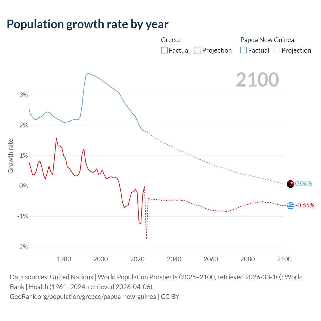- For the last 10 years, Greece has had an average growth rate of -0.47% per year vs +2.23% in Papua New Guinea.