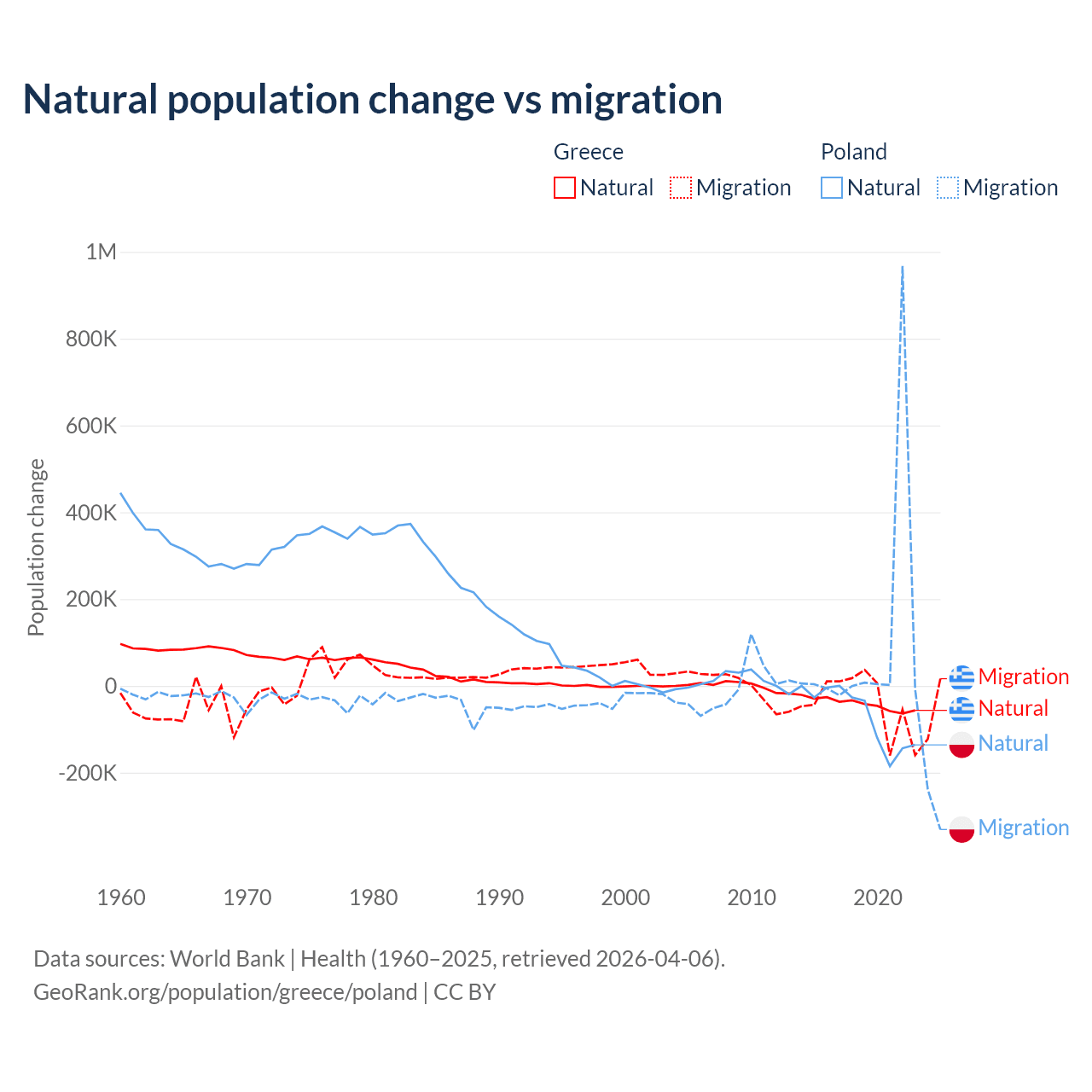 Over the last 10 years, 51.9% of the population change in Greece is from natural causes (a loss of 411,426 people) and 48.1% is from migration (a loss of 381,824 people). In Poland 41.4% is from natural causes (a loss of 675,443 people) and 58.6% is from migration (a gain of 955,766 people).