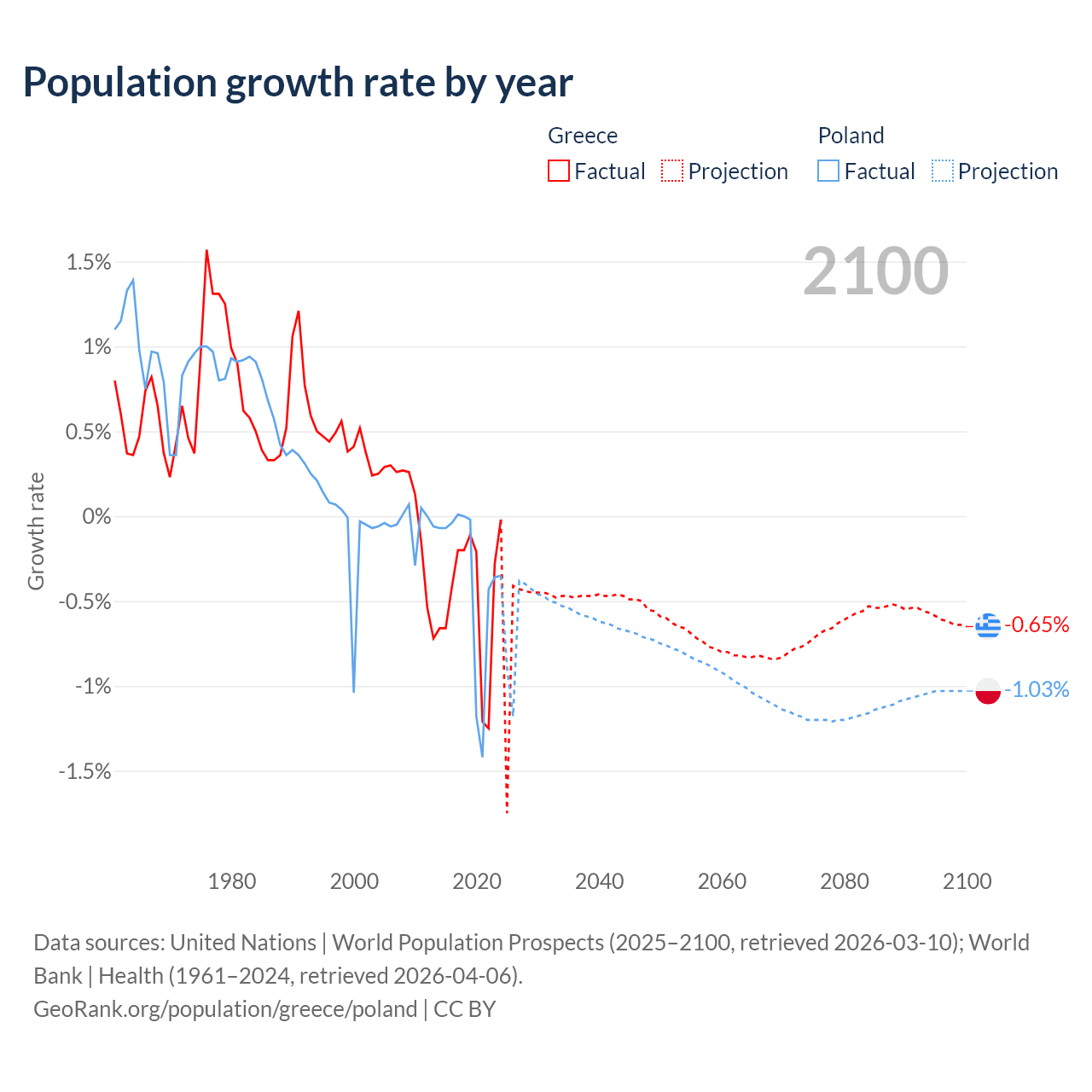 - For the last 10 years, Greece has had an average growth rate of -0.47% per year vs -0.36% in Poland.