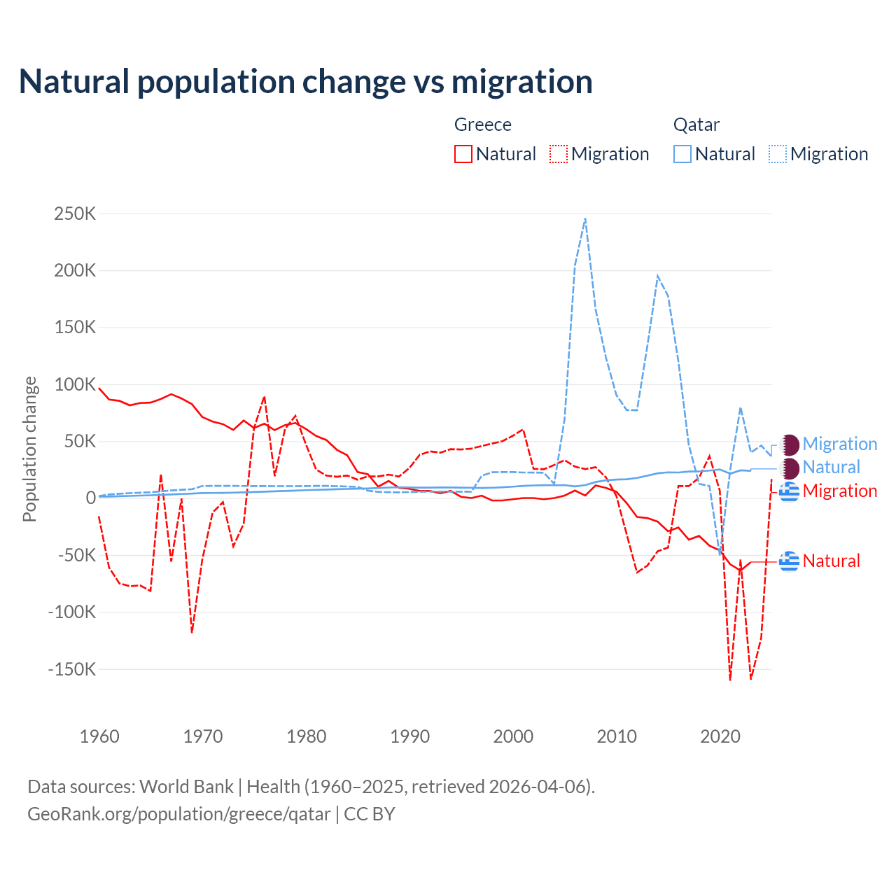 Over the last 10 years, 51.9% of the population change in Greece is from natural causes (a loss of 411,426 people) and 48.1% is from migration (a loss of 381,824 people). In Qatar 26.1% is from natural causes (a gain of 232,009 people) and 73.9% is from migration (a gain of 655,712 people).