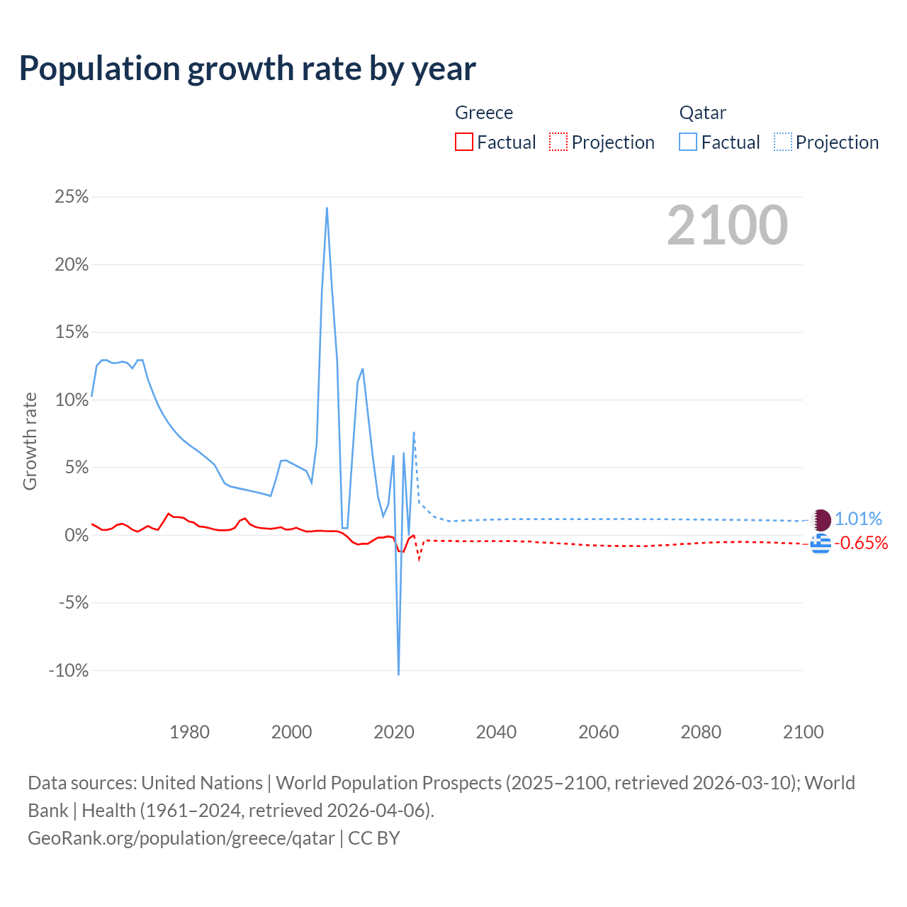 - For the last 10 years, Greece has had an average growth rate of -0.47% per year vs +3.86% in Qatar.