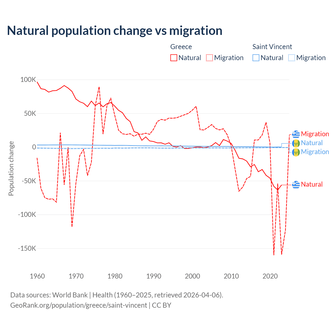 Over the last 10 years, 51.9% of the population change in Greece is from natural causes (a loss of 411,426 people) and 48.1% is from migration (a loss of 381,824 people). In Saint Vincent 21.2% is from natural causes (a gain of 2,525 people) and 78.8% is from migration (a loss of 9,393 people).