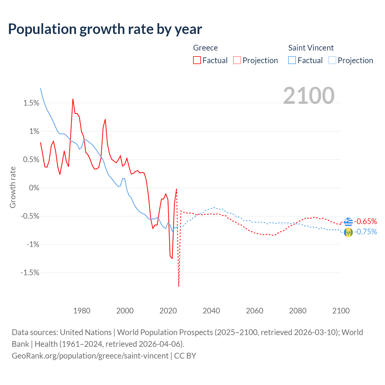 - For the last 10 years, Greece has had an average growth rate of -0.47% per year vs -0.65% in Saint Vincent.