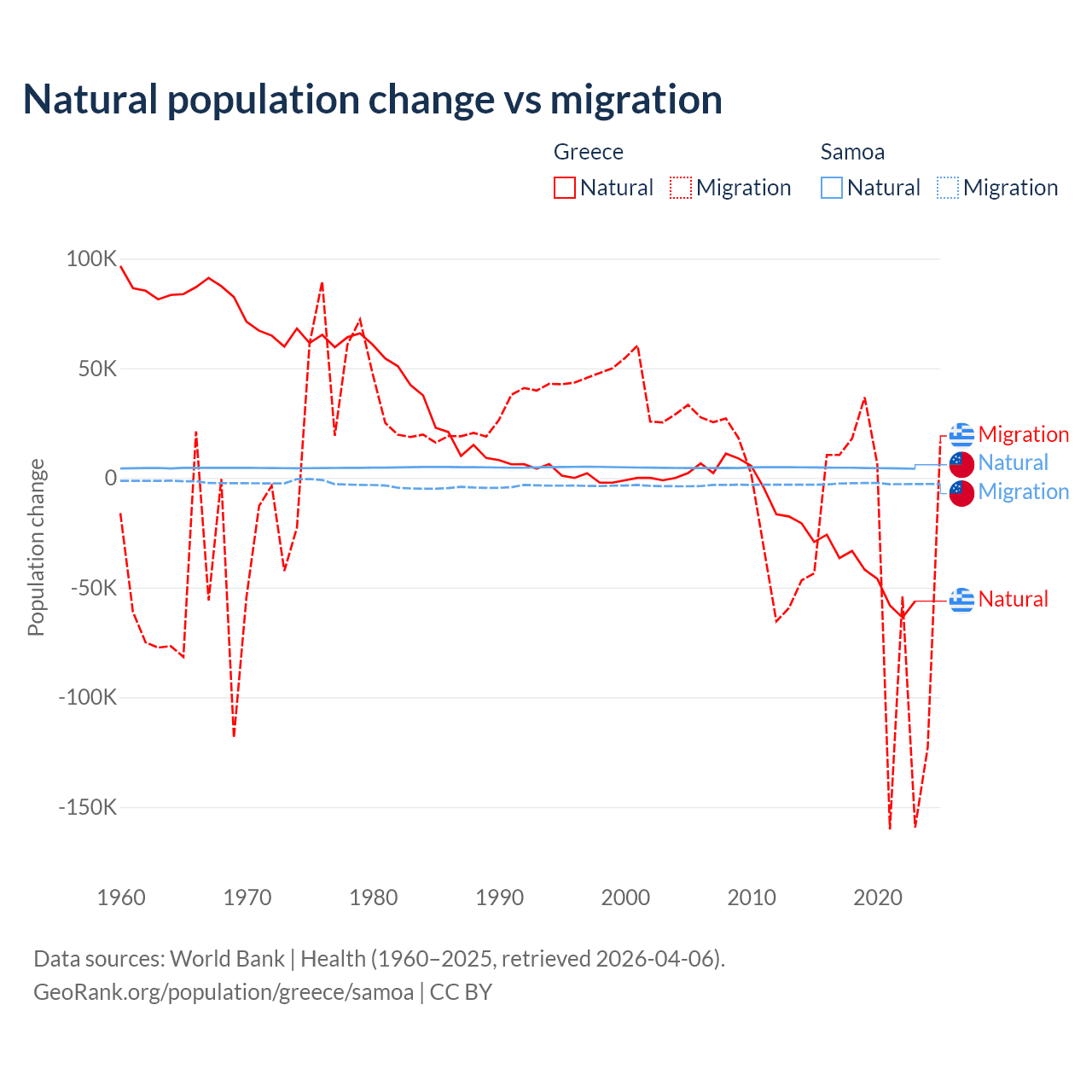 Over the last 10 years, 51.9% of the population change in Greece is from natural causes (a loss of 411,426 people) and 48.1% is from migration (a loss of 381,824 people). In Samoa 62.5% is from natural causes (a gain of 45,436 people) and 37.5% is from migration (a loss of 27,246 people).