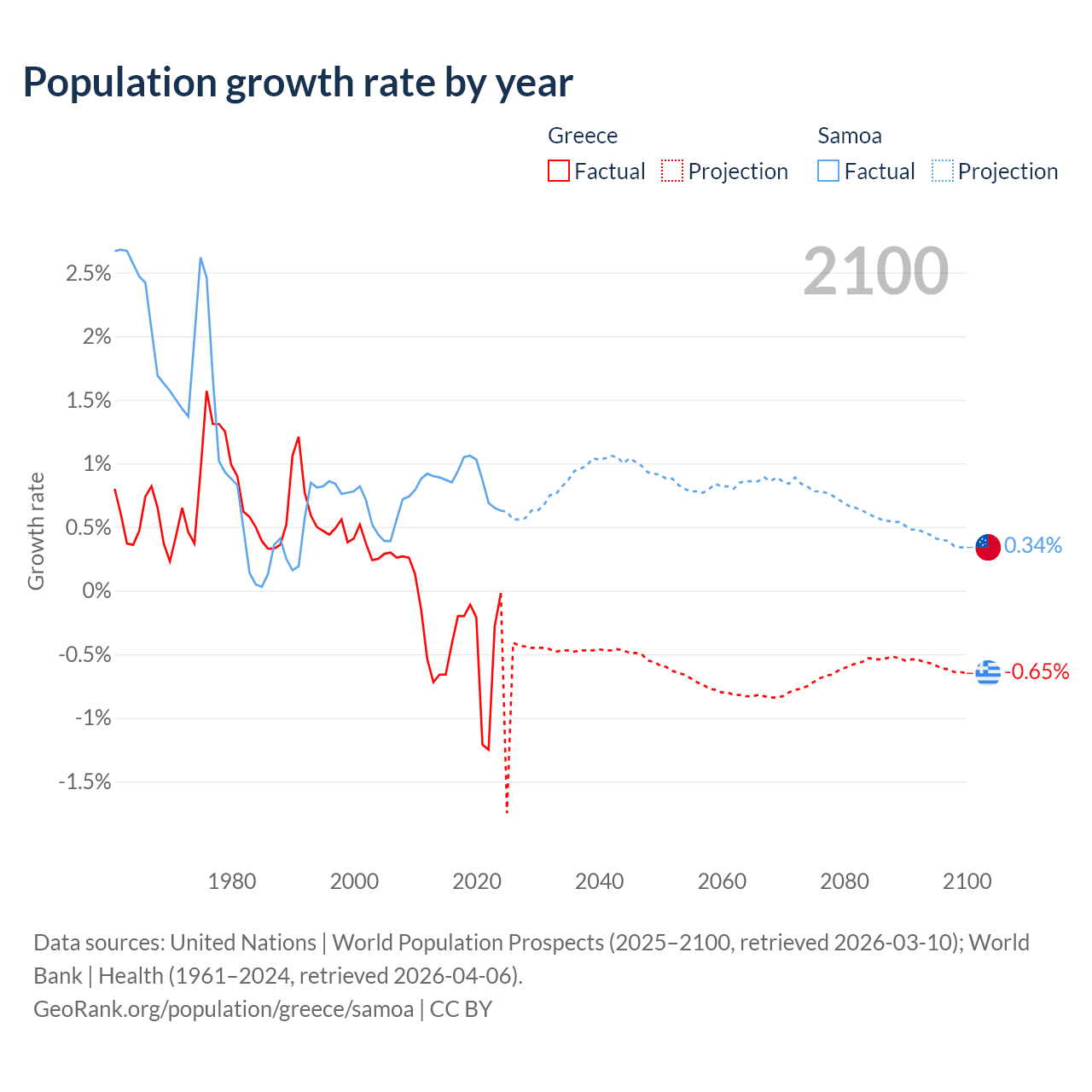 - For the last 10 years, Greece has had an average growth rate of -0.47% per year vs +0.87% in Samoa.