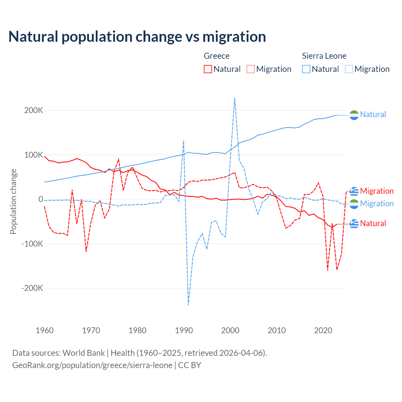 Over the last 10 years, 51.9% of the population change in Greece is from natural causes (a loss of 411,426 people) and 48.1% is from migration (a loss of 381,824 people). In Sierra Leone 99.6% is from natural causes (a gain of 1,764,049 people) and 0.41% is from migration (a loss of 7,211 people).