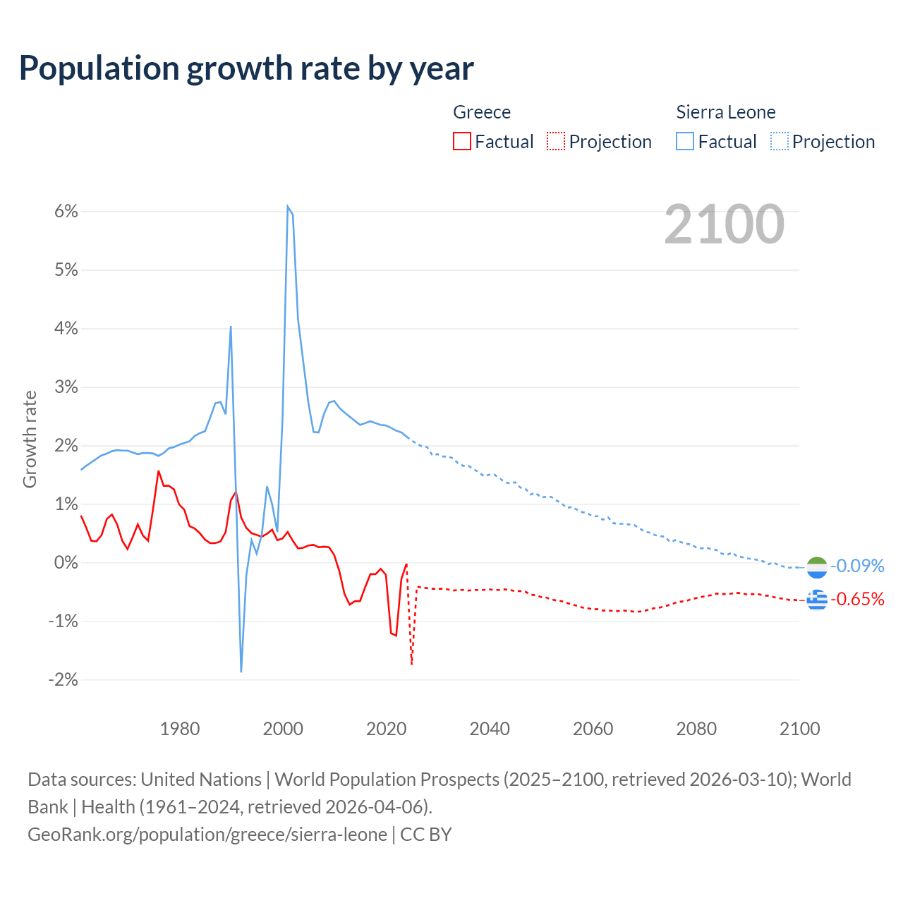 - For the last 10 years, Greece has had an average growth rate of -0.47% per year vs +2.32% in Sierra Leone.