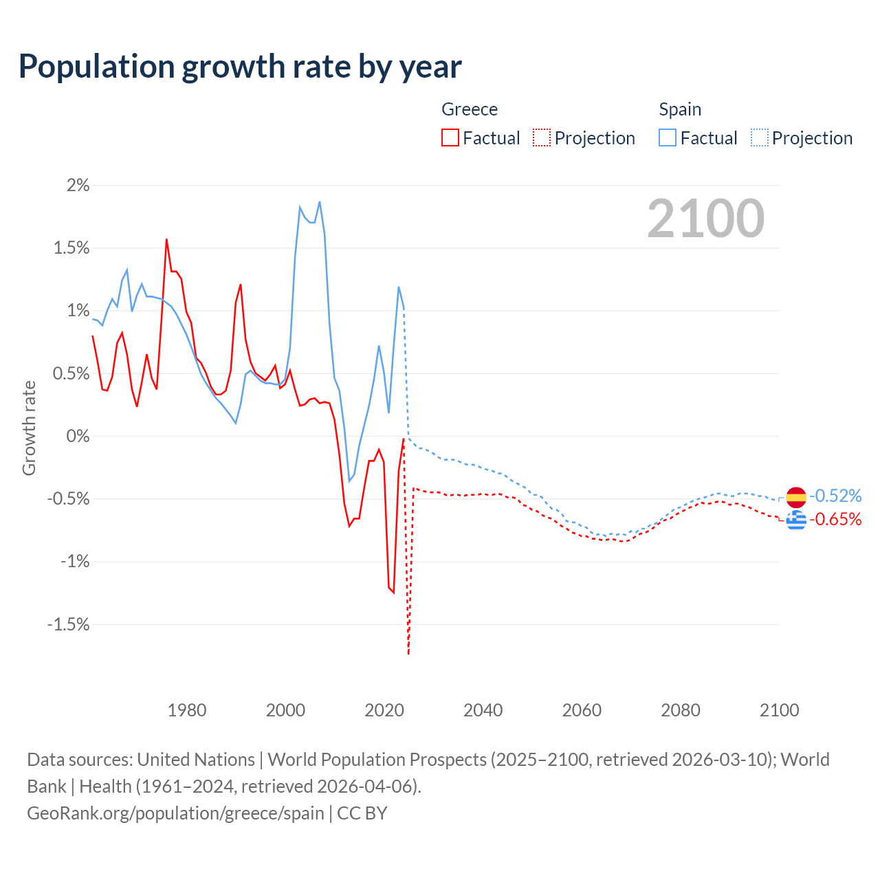 Data sources: World Bank | Health (1960–2024, retrieved 2026-04-06); United Nations | World Population Prospects (1960–2026, retrieved 2026-03-10); U.S. Census Bureau (1960–2025, retrieved 2026-02-08); Central Intelligence Agency (CIA) (2000–2019, retrieved 2026-02-20).