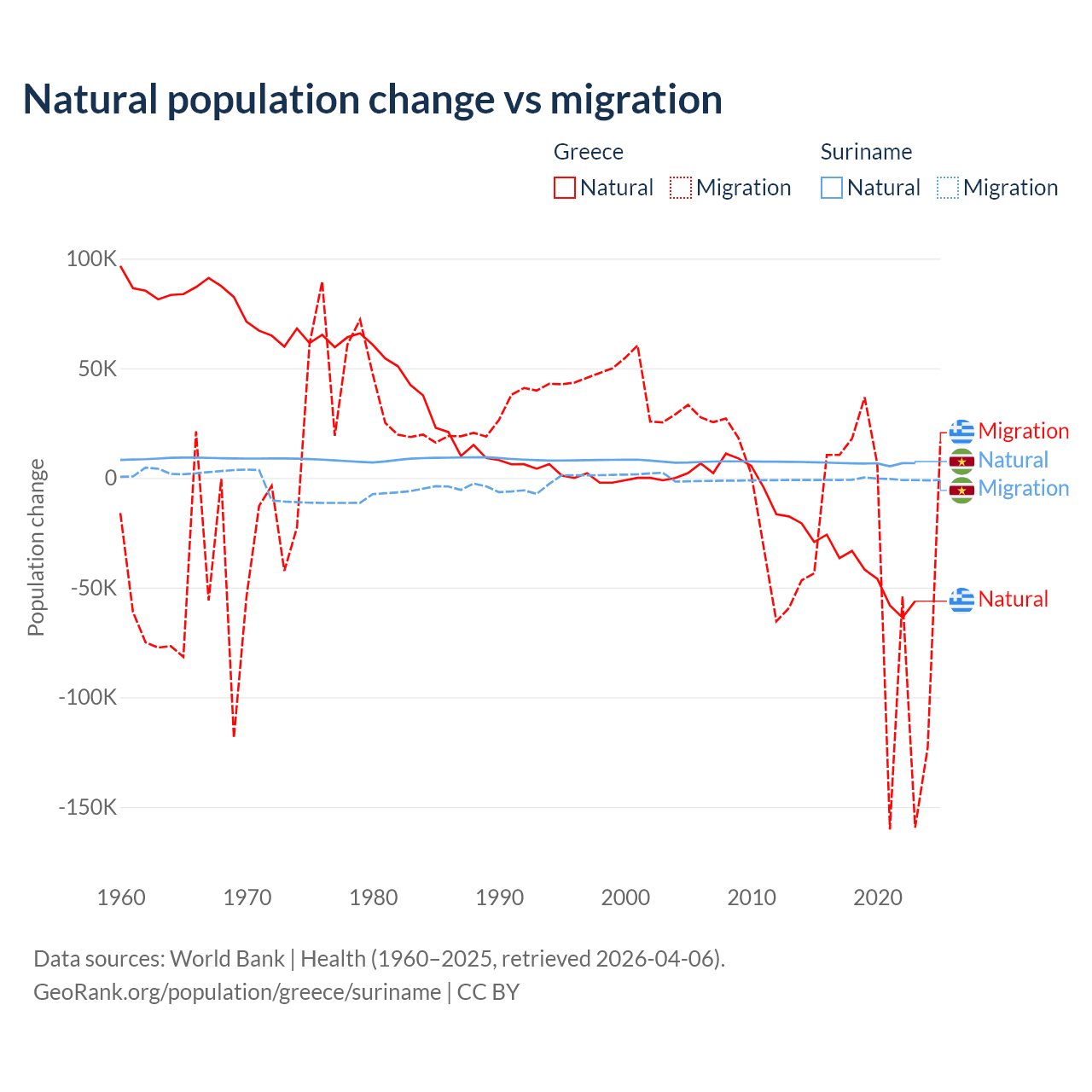 Over the last 10 years, 51.9% of the population change in Greece is from natural causes (a loss of 411,426 people) and 48.1% is from migration (a loss of 381,824 people). In Suriname 90.3% is from natural causes (a gain of 66,709 people) and 9.72% is from migration (a loss of 7,185 people).